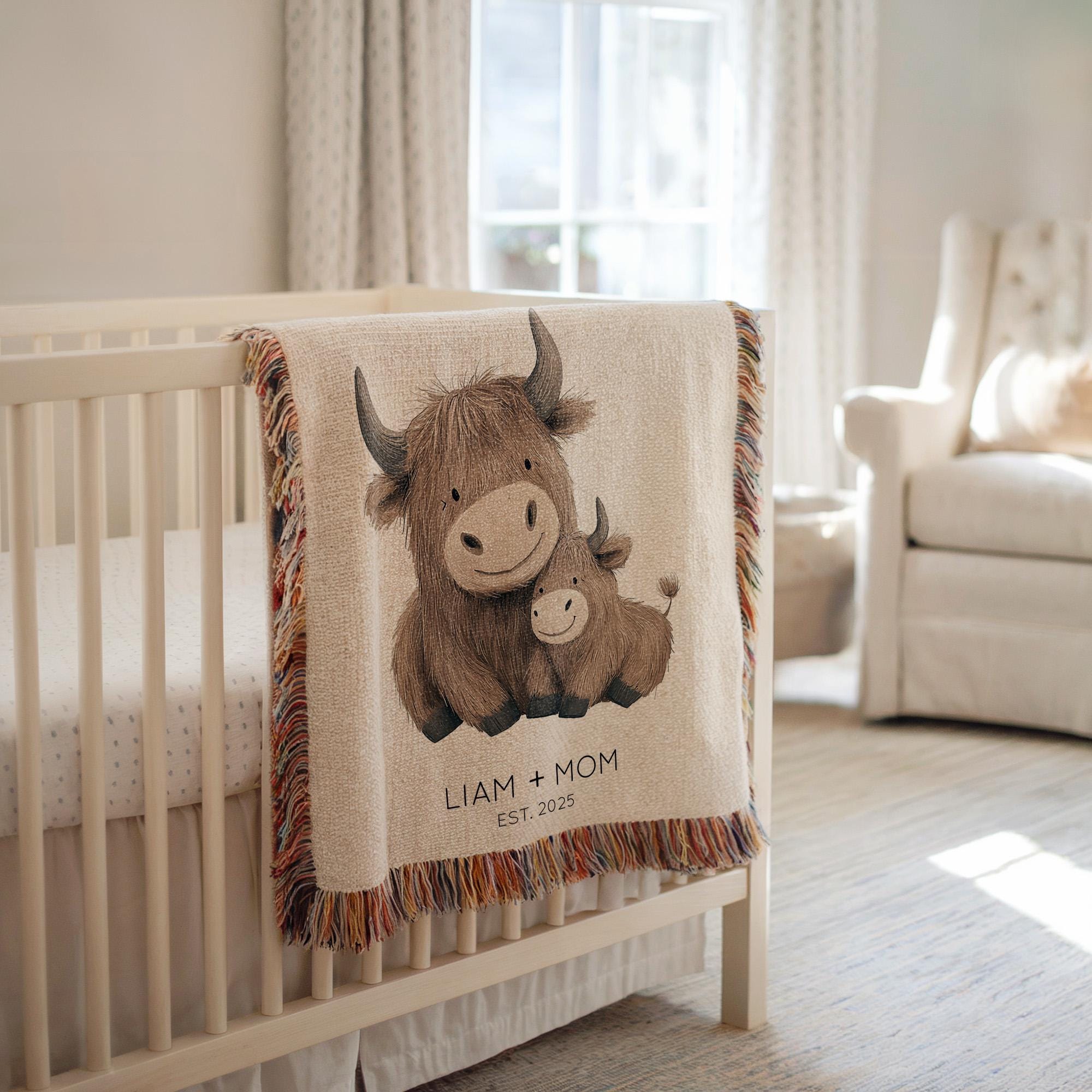 Personalized Highland Cow Mom & Baby Blanket, Custom Highland C...