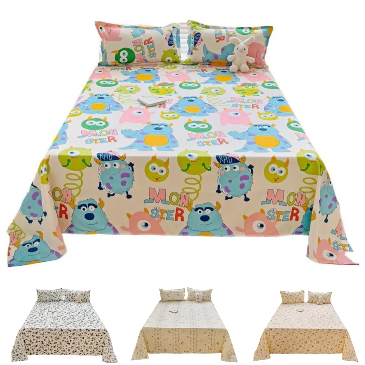 1PC or 3PCS Bed Flat Sheet Pillowcases Bed Cartoon Printed Top Shee...