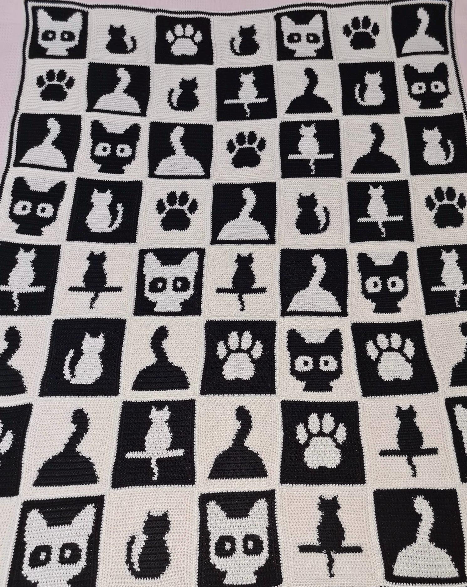 Crochet Cat Blanket,Cat Bedspread,Granny Square Cat Throw,Black&...