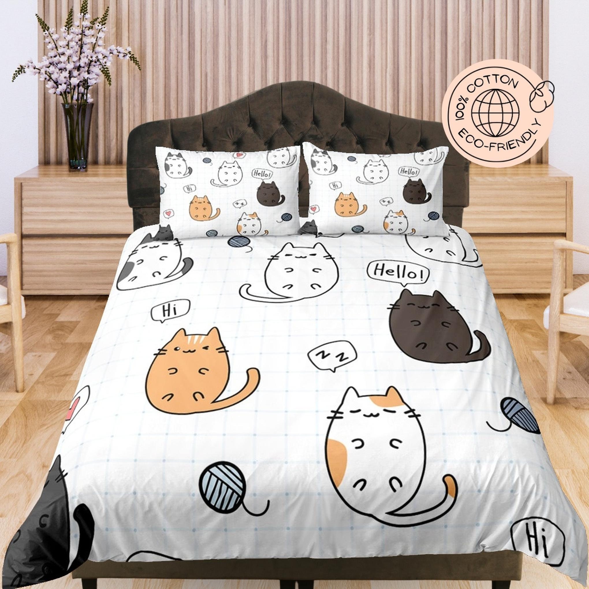 "Adorable cartoon cat duvet cover set with a playful design in white and multicolor. Perfect fo...