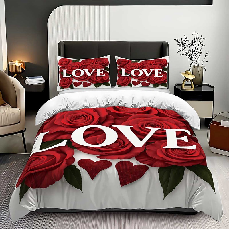 Red Rose Love 3-Piece Down Duvet Cover Set for Large Bed, Soft Shor...