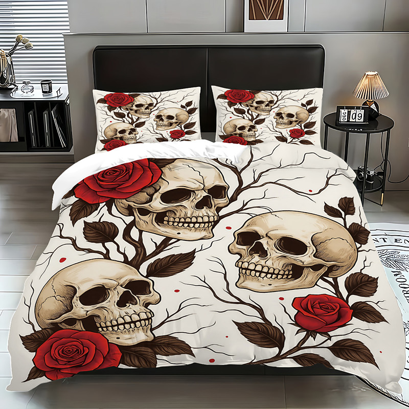 Skull Head Rose Flower 3-Piece Down Duvet Cover Set for Queen Bed, ...