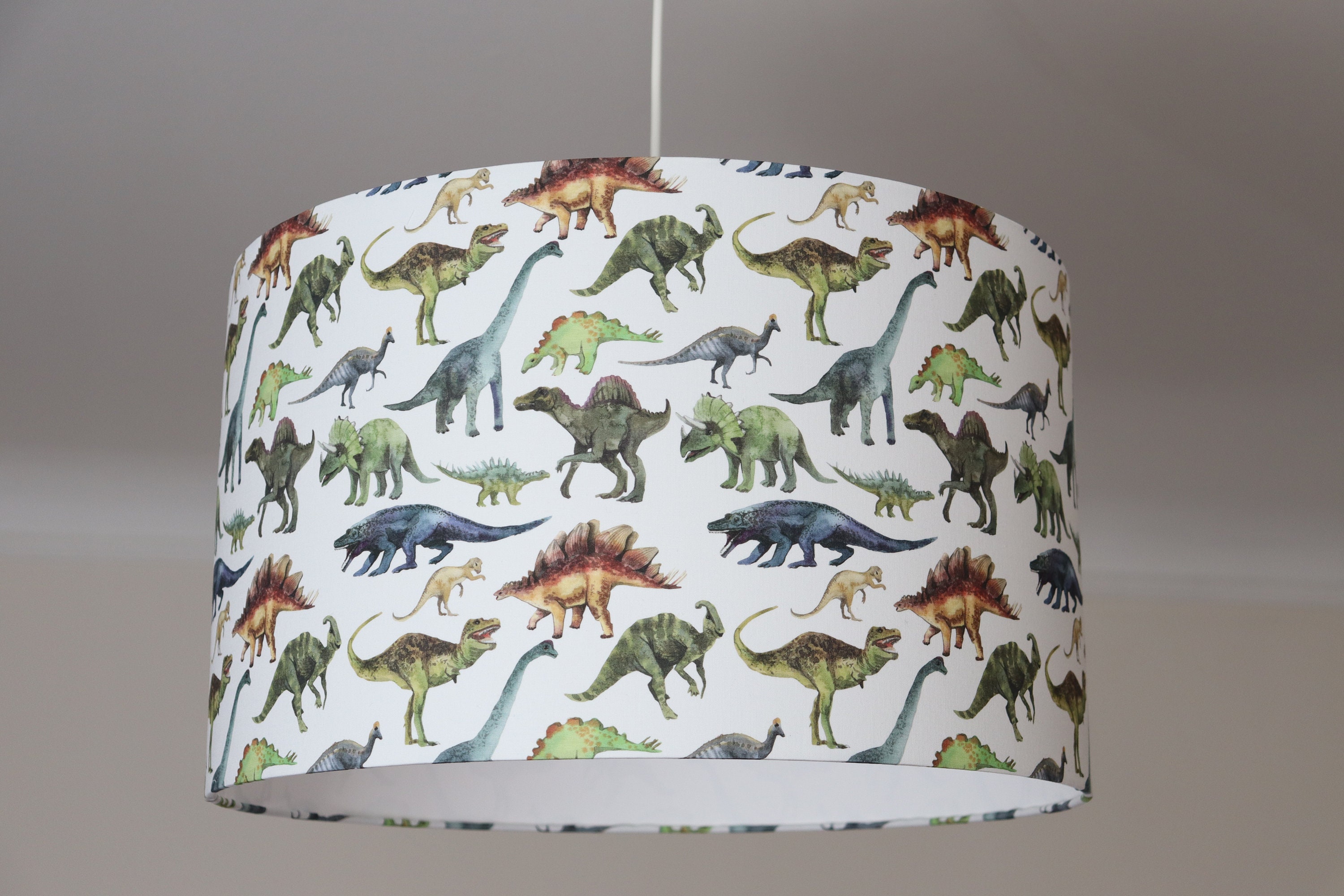 "A beautiful, high-quality lampshade for a child's room. White cotton fabric with dinosaurs. Th...