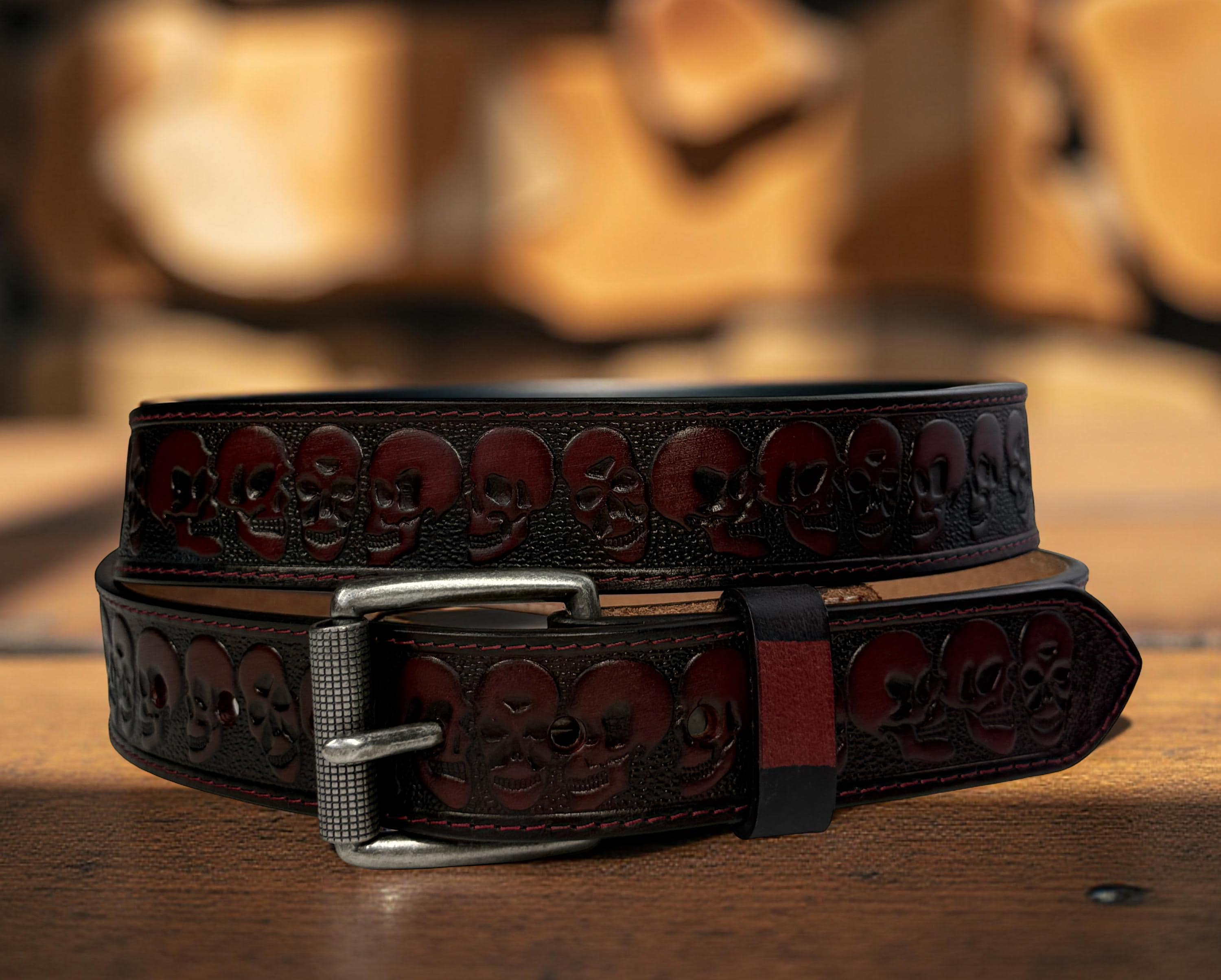 Leather Belt - Skull Embossed Leather Biker belt Skull Tooled Weste...