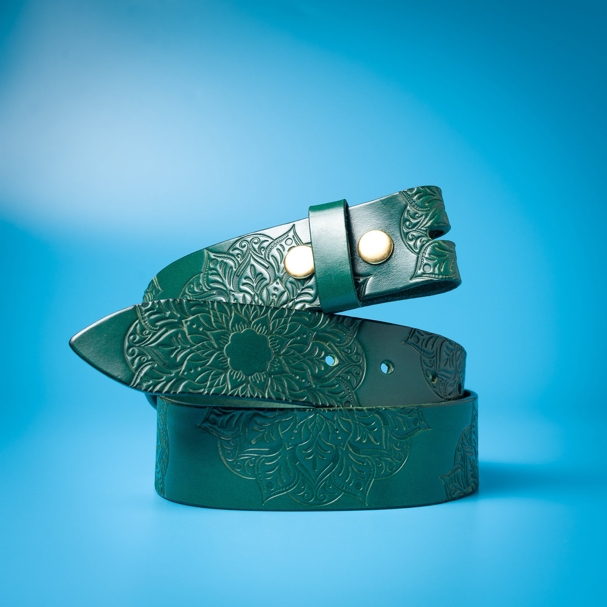 "Emerald green buckleless leather belt with an embossed mandala floral ornament, Belt Without B...