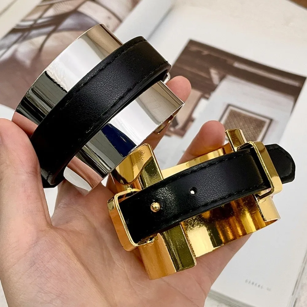 Armlet Exaggerated Metal Bangle Golden Wrist Jewelry Belt Buckle Leather Bracelet Geometric Irregula...