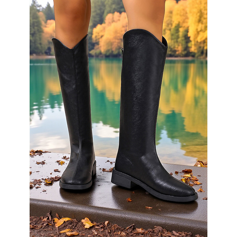 Women's Black Knee-High Riding Boots with Low Block Heels, Sleek Mi...