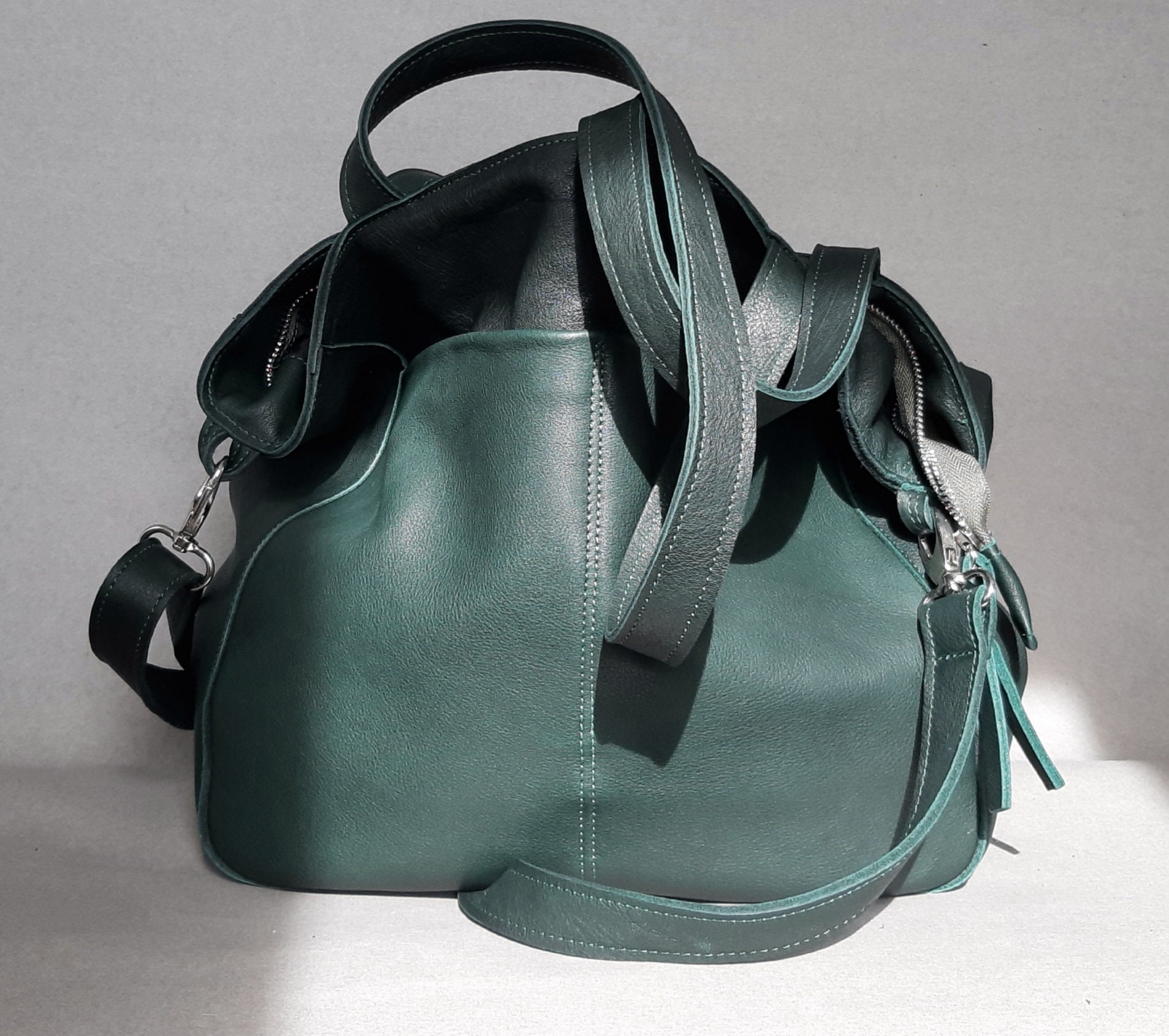 Emerald Green Leather Shoulder Bag, Large Soft Tote with Pockets
