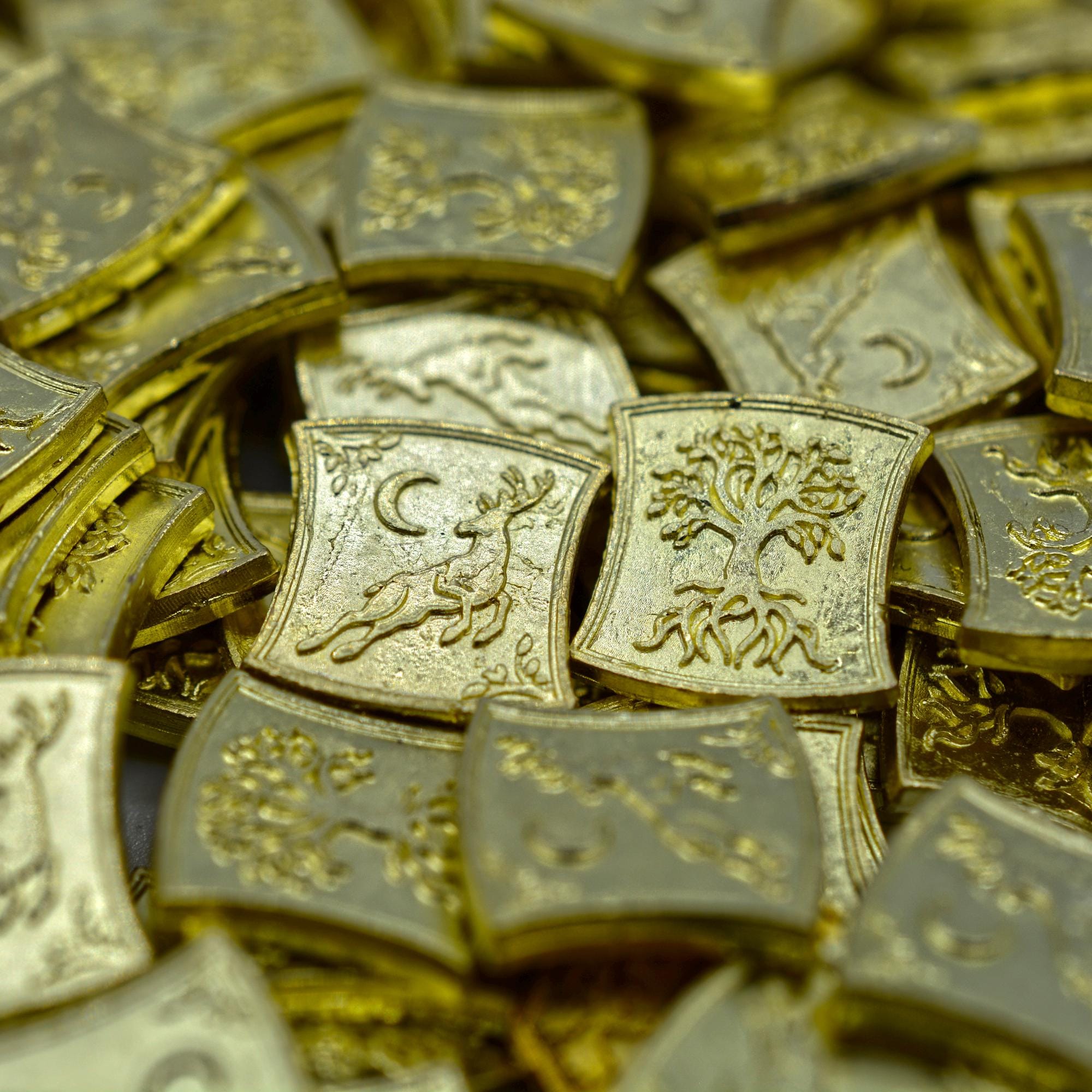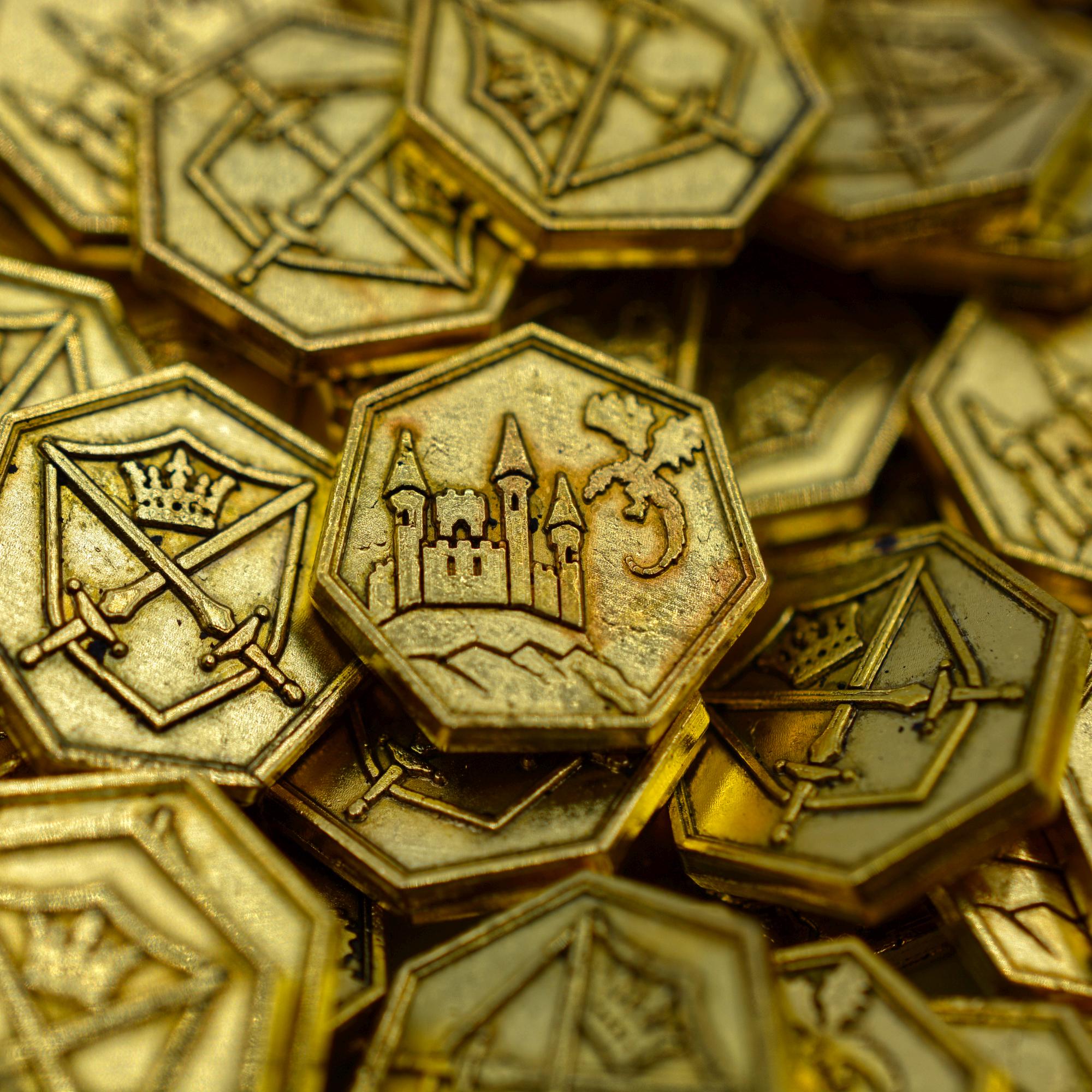 Bring your game to life with this set of 100 miniature gold Elven Themed metal coins, crafted specif...