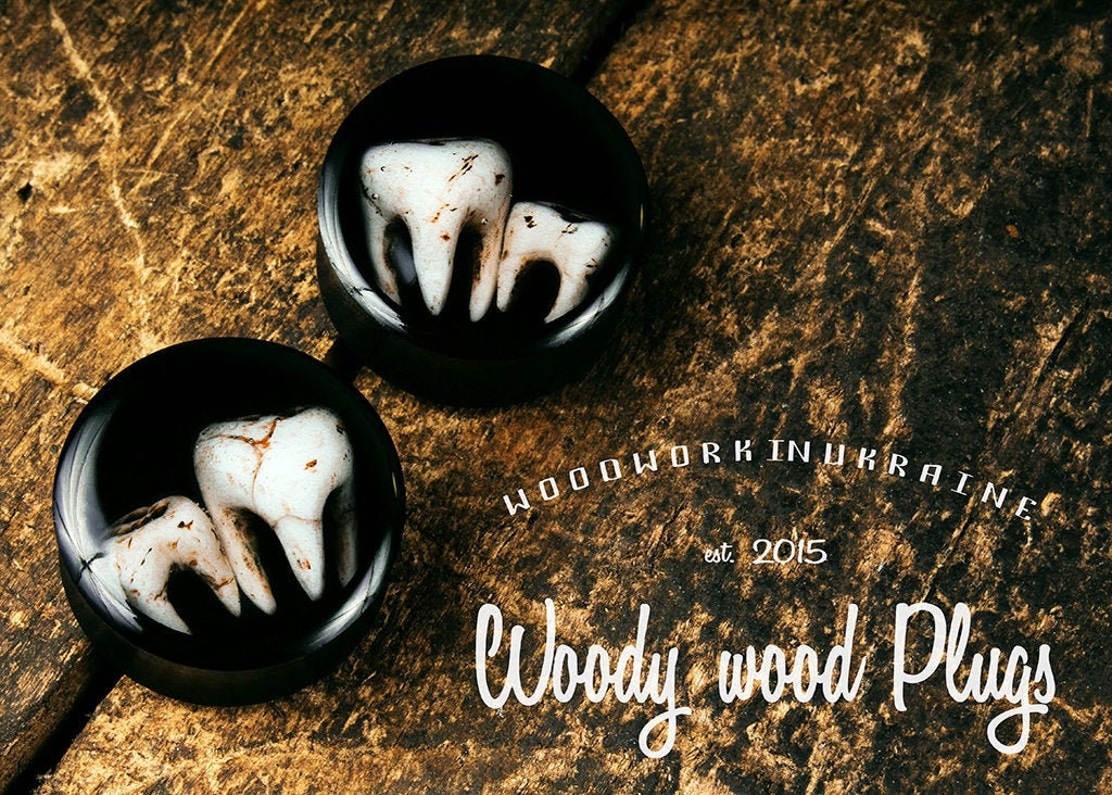 Black ebonite ear plugs with polymer Teeth inlay - Teeth plugs - ga...
