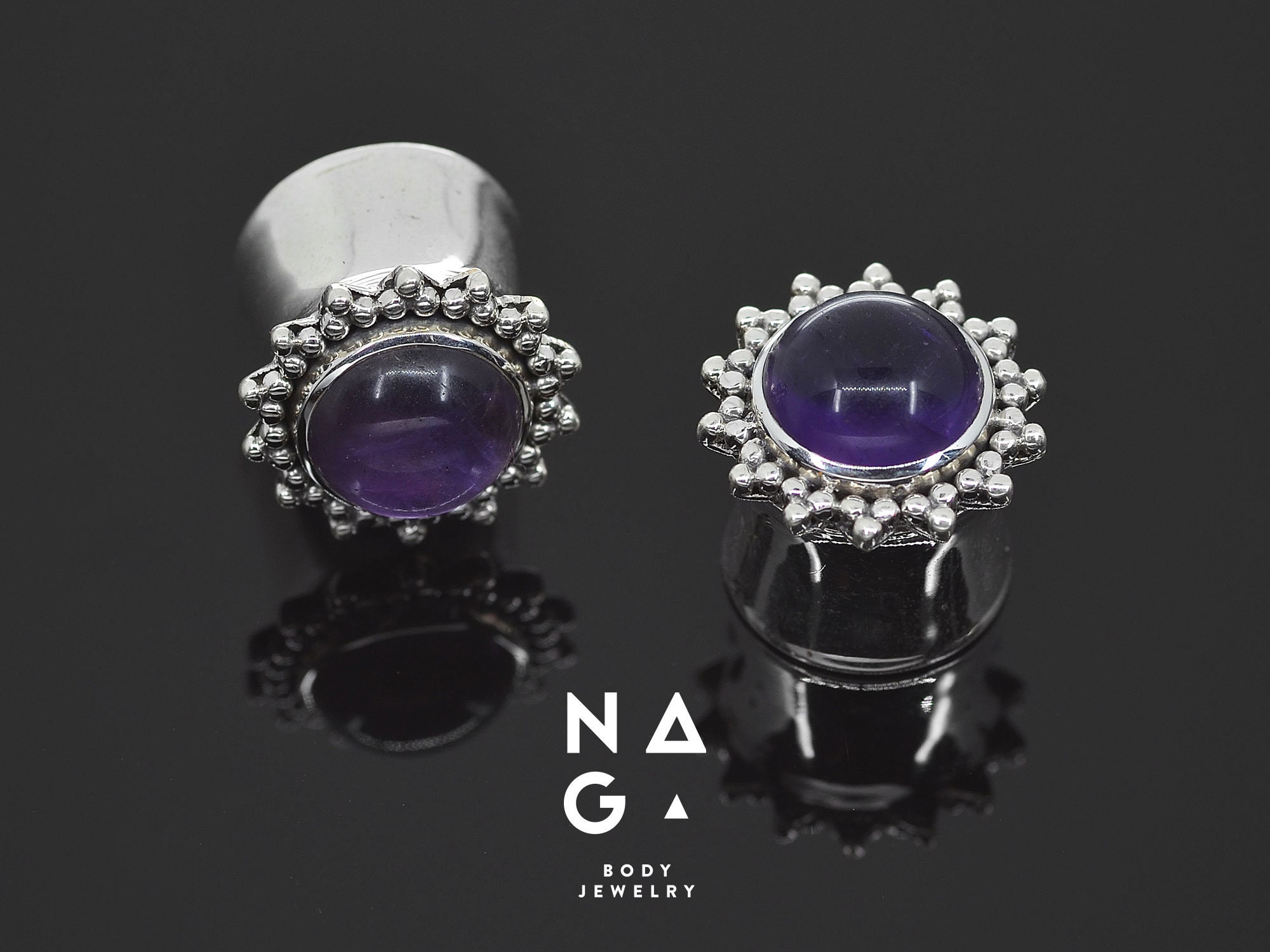 1 Pair of AMETHYST ear plugs, silver ear plugs, ear gauges, ear str...