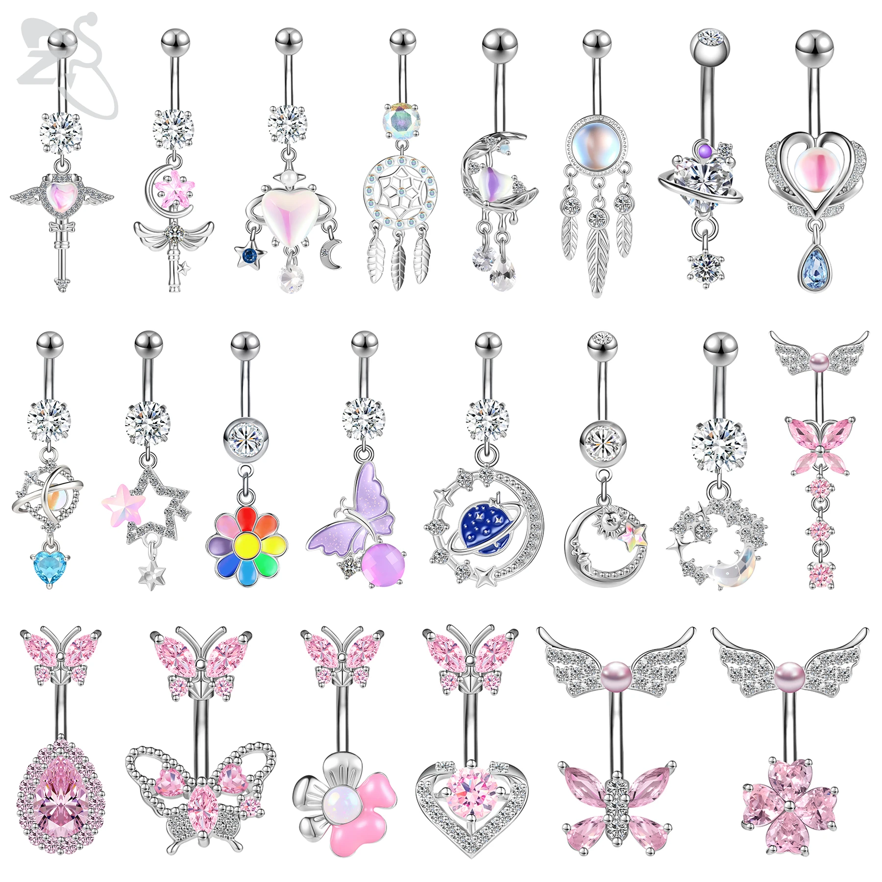 ZS 1 PC Stainless Steel Belly Button Ring Women CZ Crystal Pendant Navel Piercings Pink Butterfly Fl...