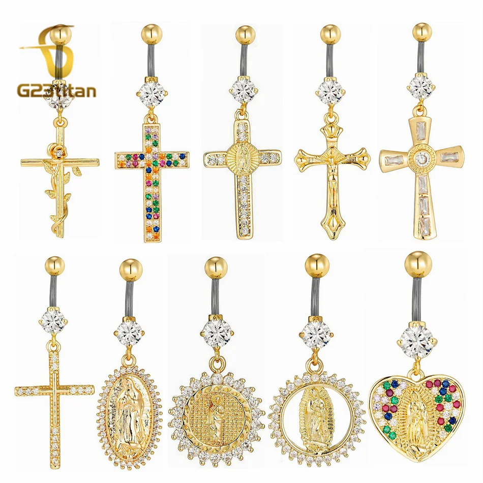 Golden Cross Navel Rings Luxury Virgin Mary Jesus Charm Dangle Belly Button Piercing Jewelry Christi...