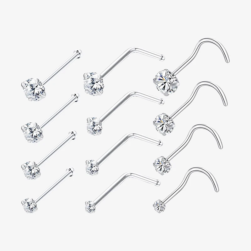 8pcs 1.5/2/2.5/3mm Cubic Zirconia Nose Piercing Jewelry Nose Studs, I L Shaped Shiny Crystal Bone No...