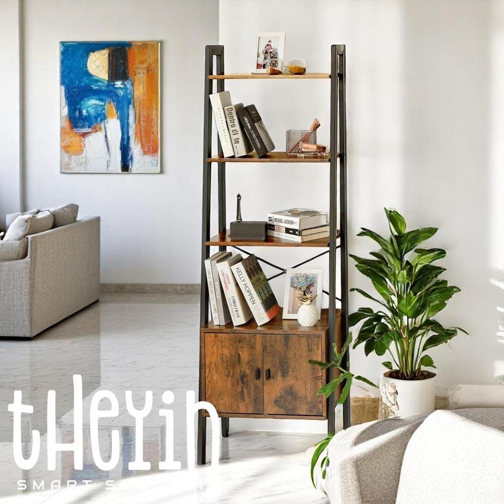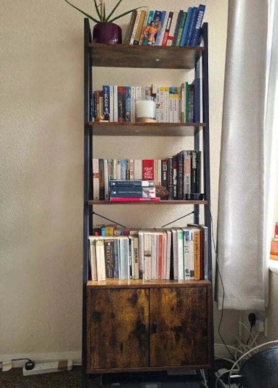Rustic Ladder Bookcase with Cupboard - 5-Tier Wood & Metal Shelf Unit for Living Room, Office or...