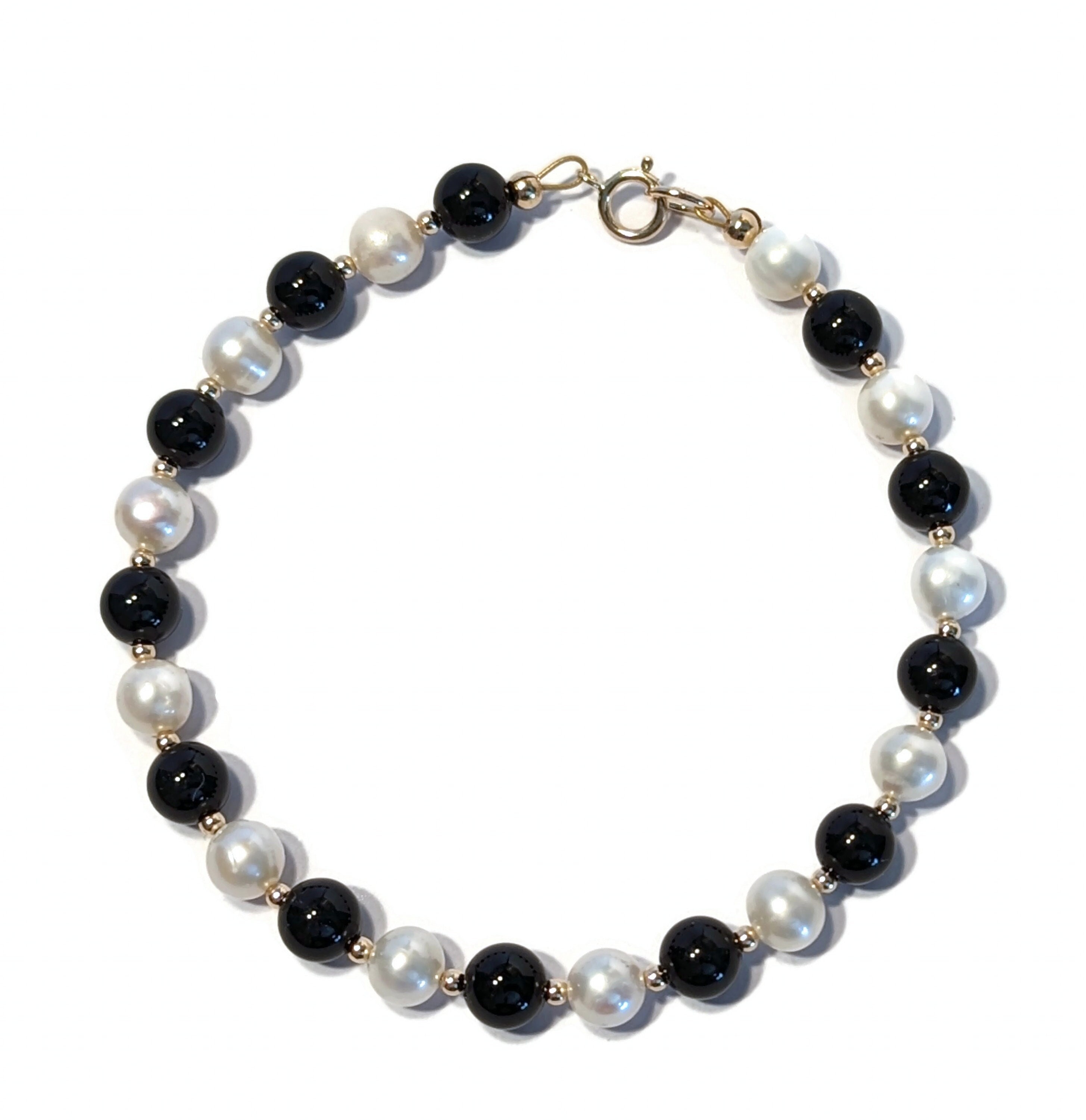 9ct Gold Pearl Bracelet with Black Onyx, Natural White Freshwater P...