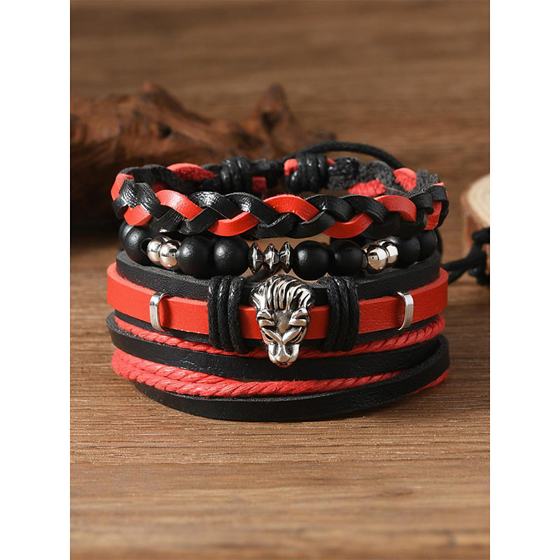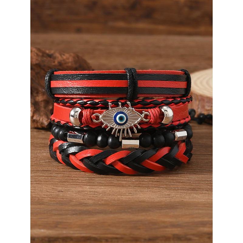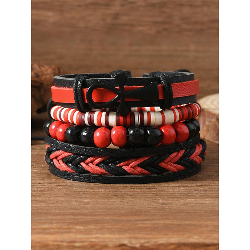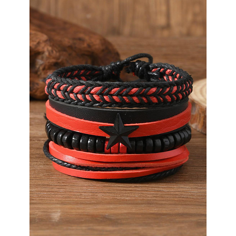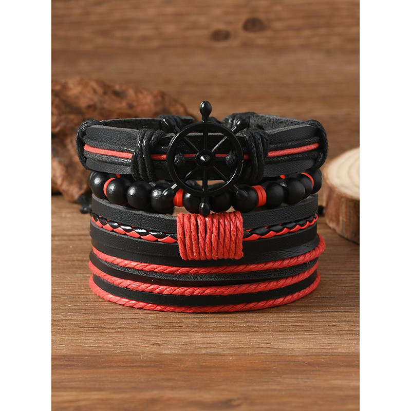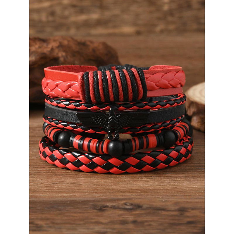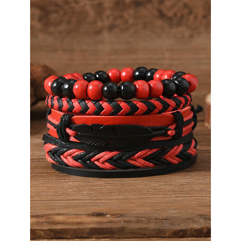 Men's Faux Leather Bracelet Set, Red and Black Woven Bracelets with...