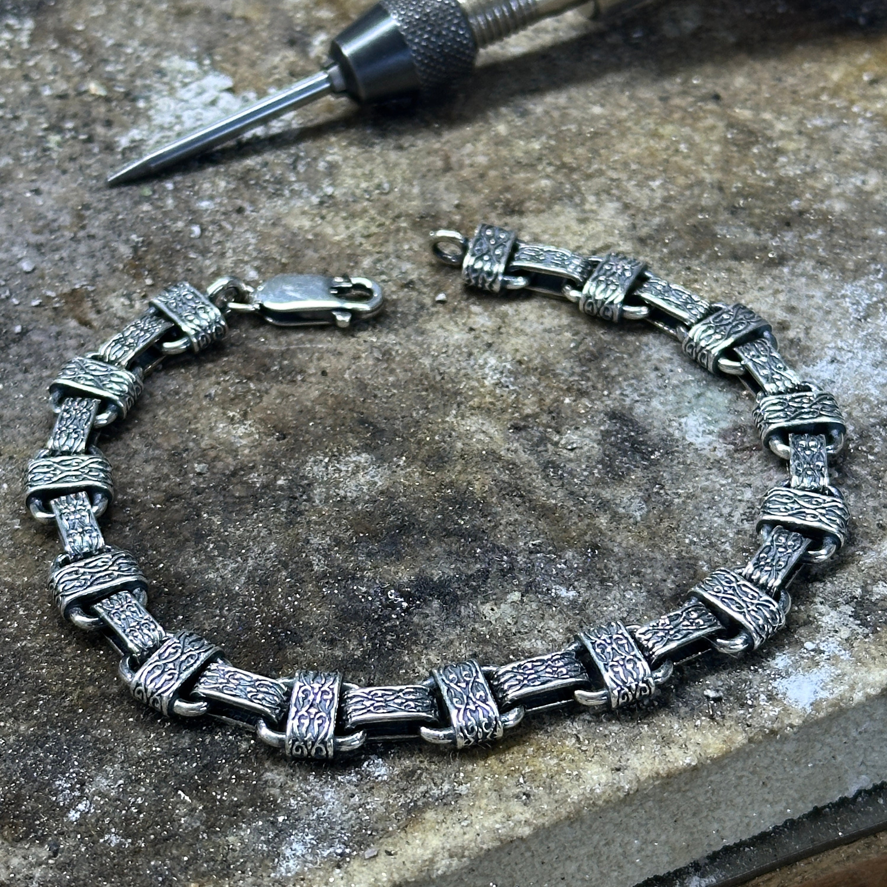 Silver Chain Bracelet , Norse Chain Bracelet , Hand-Engraved Silver...