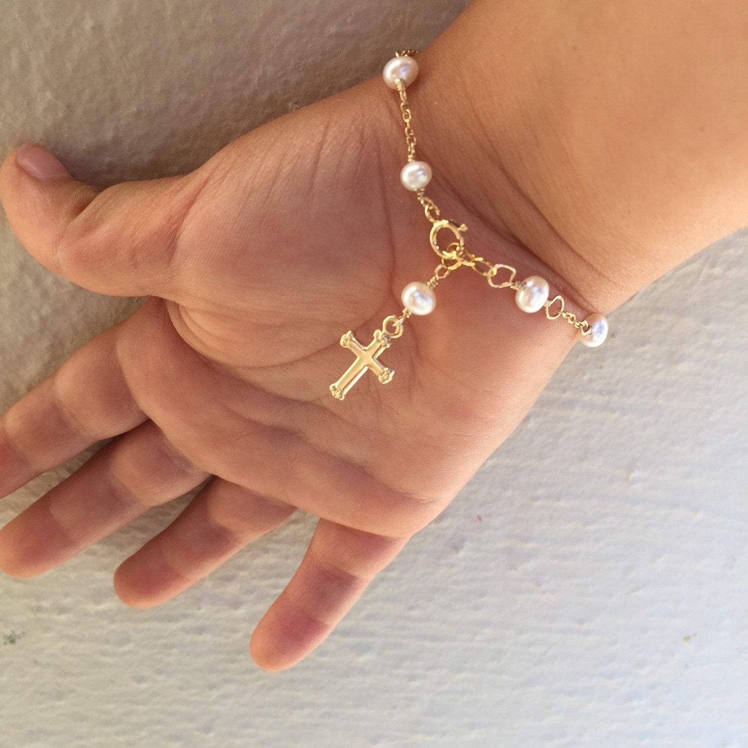 Baby Bracelet Gold Cross Baby Bracelet Gold Baptism Jewelry Pearl B...
