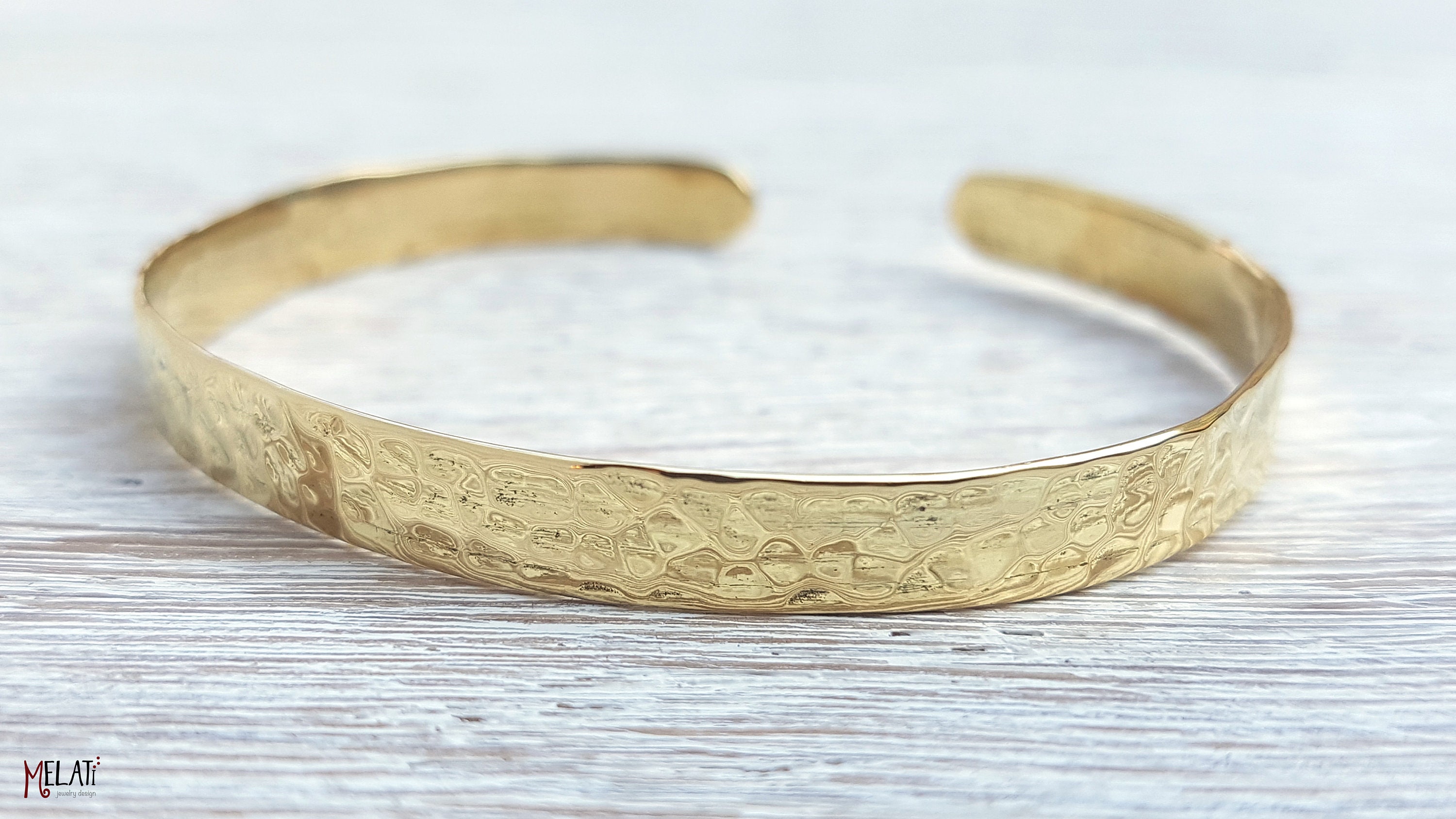 Handcrafted brass bangle with a hammered surface texture. Simple yet elegant. A tip for putting it o...