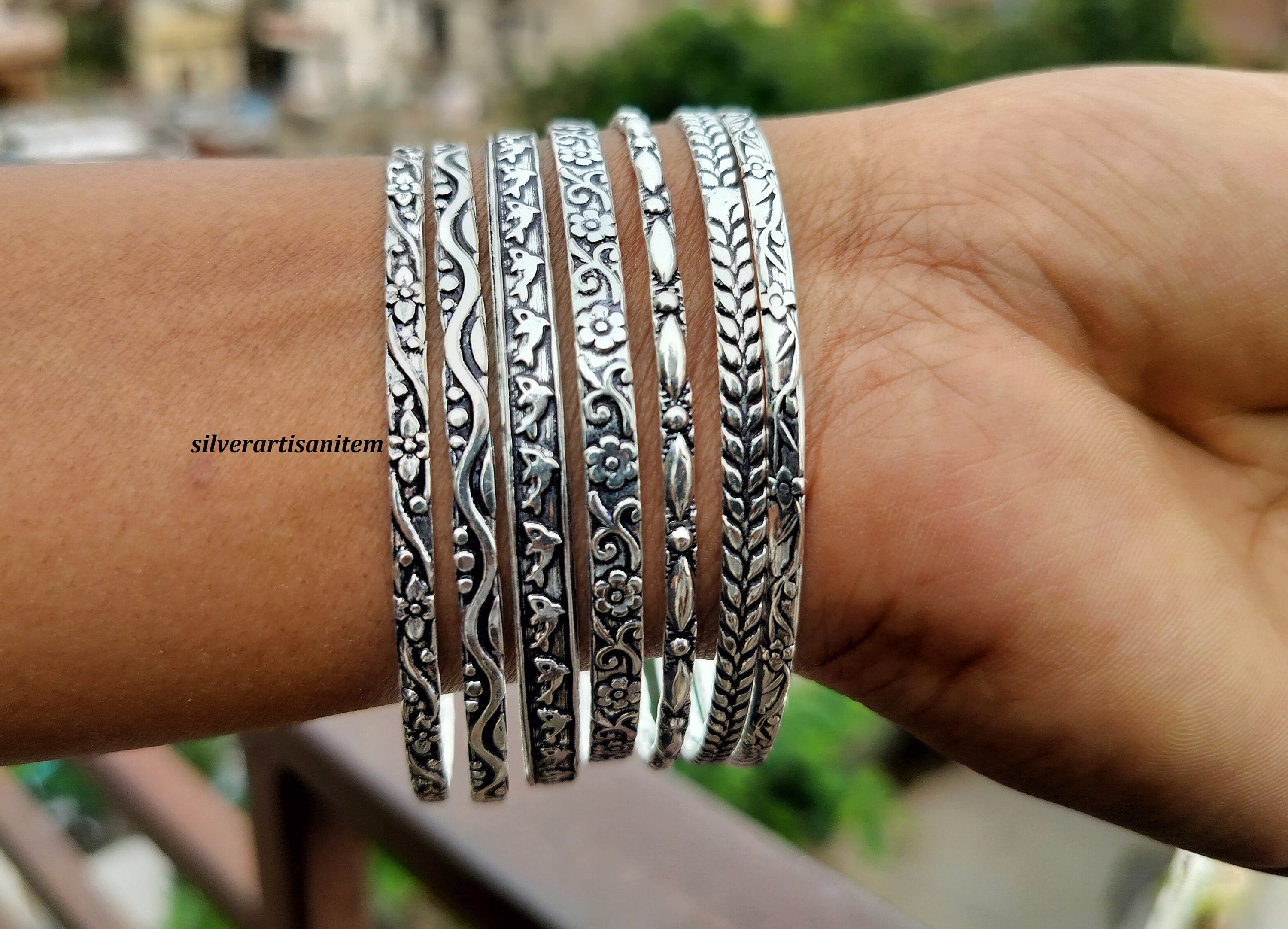 welcome to my silverartisanitem shop Solid 925 Sterling Silver Bangles, 7 Set of Bangles, Flower Ban...