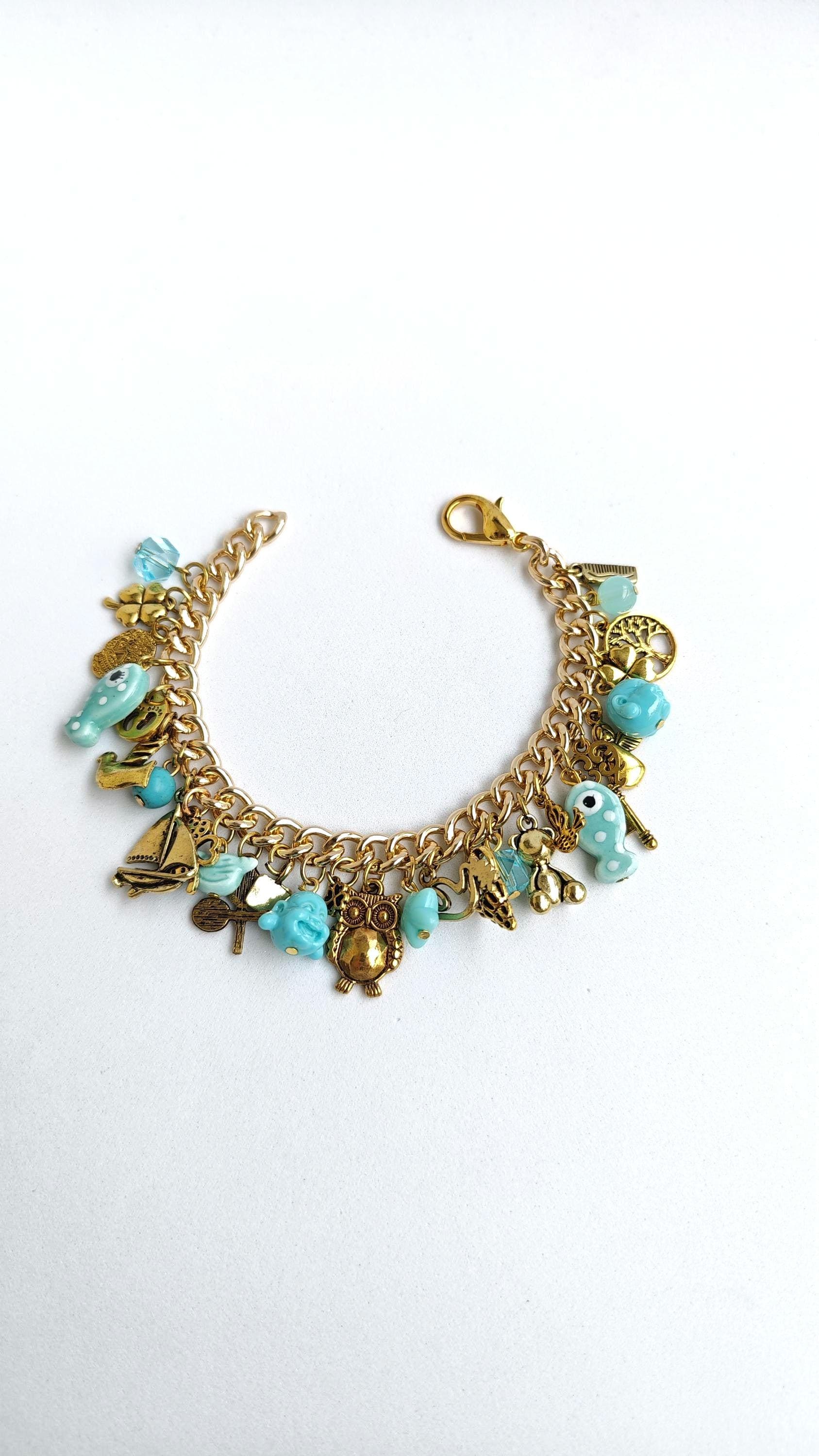 charm bracelet, turquoise golden charm bracelet charms for woman, vintage charm bracelet, gold charm...