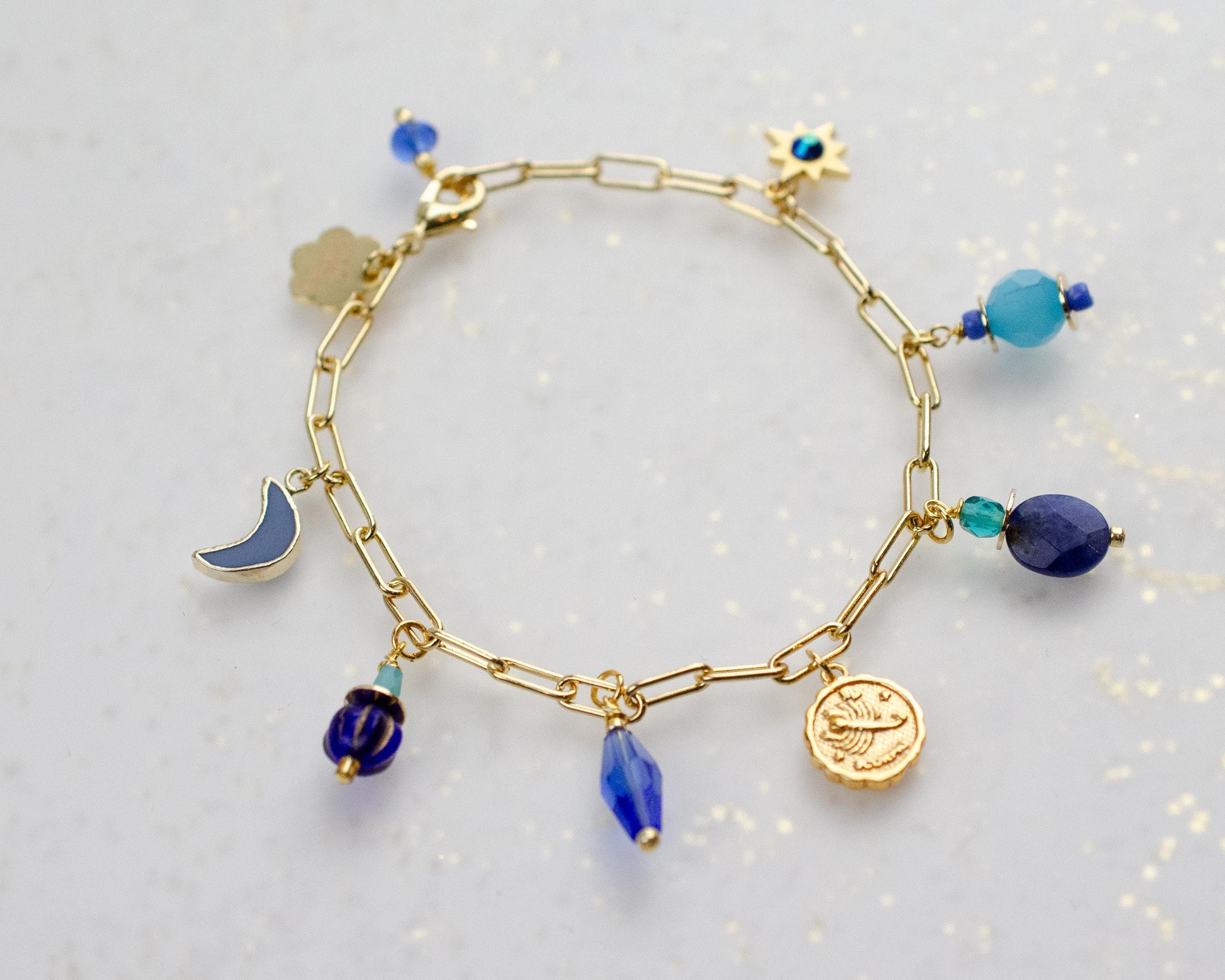 Pearl charm bracelet, colorful charm bracelet, moon charm bracelet,...