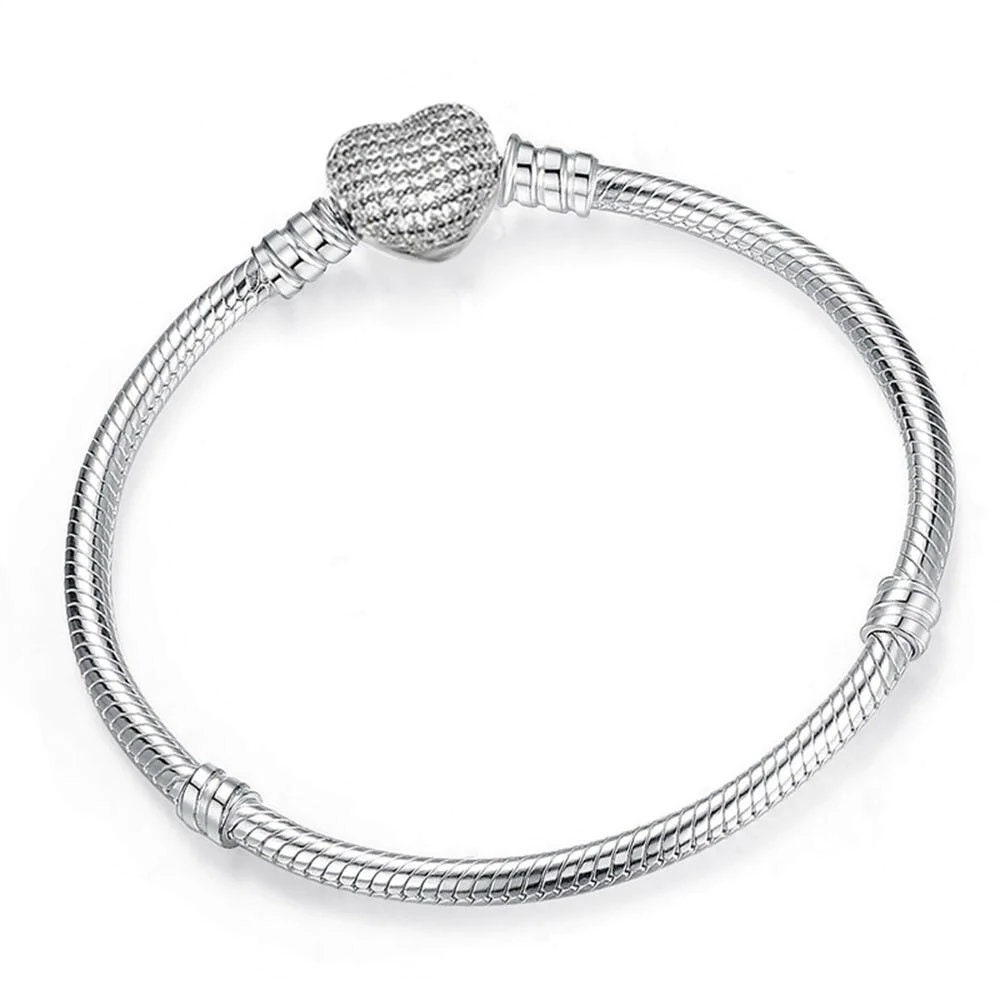 Sterling Silver Pandora Style Bracelet, Silver Snake Chain Heart Cl...
