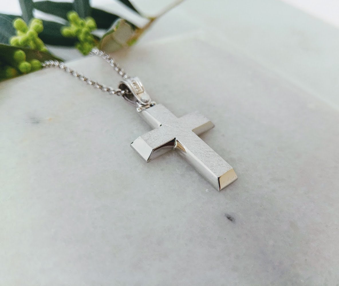 "A beautiful white gold cross in K14 with slantwise angles. A simple, minimal, inter temporal c...