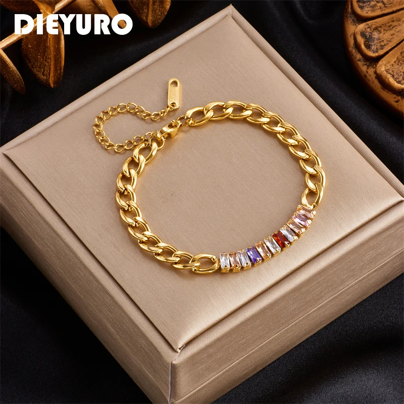 DIEYURO 316L Stainless Steel Square Colored Zircon Bracelet For Women New Trend Female Wrist Jewelry...