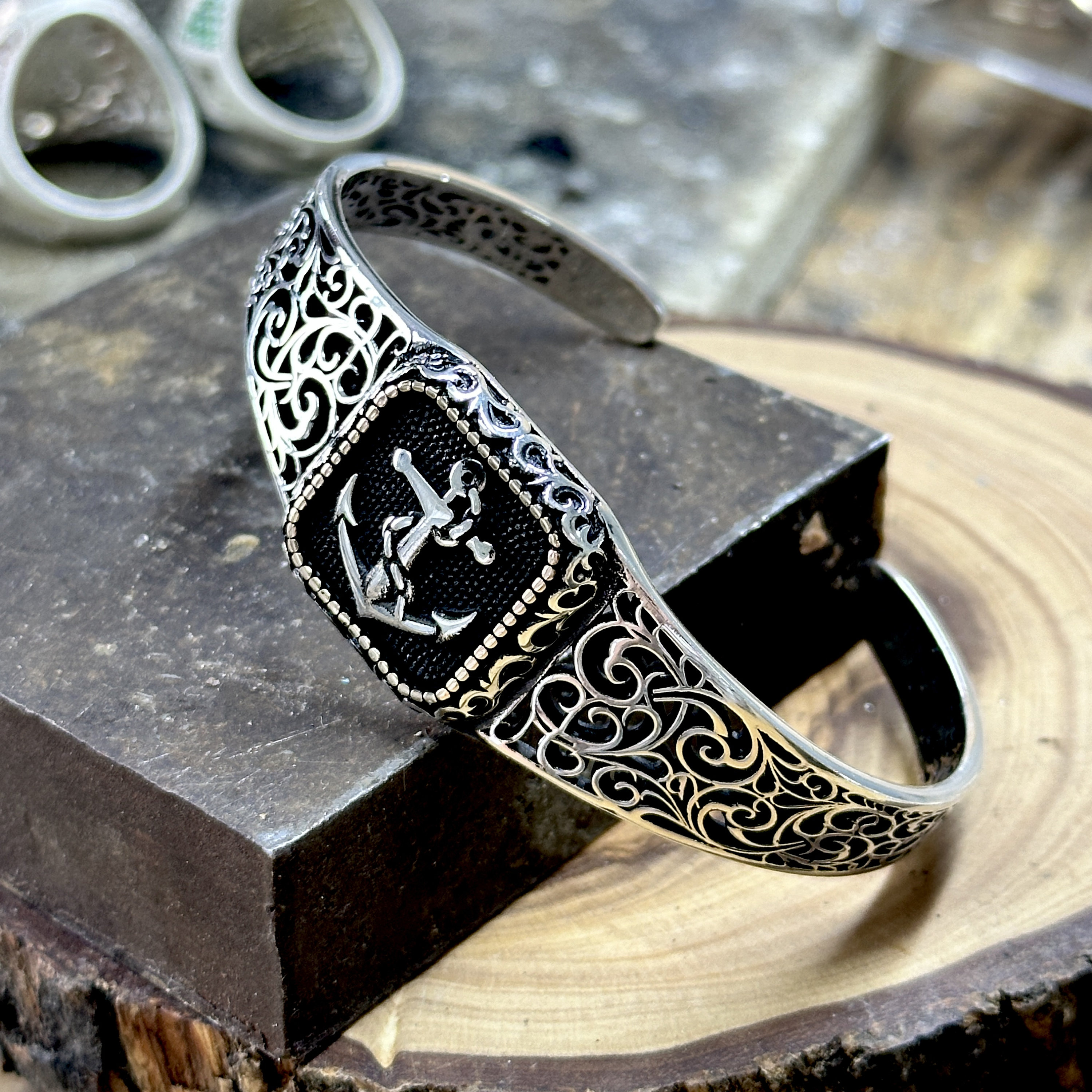 Men Silver Cuff Bracelet , Anchor Cuff Bracelet, Men Sailor Bracele...