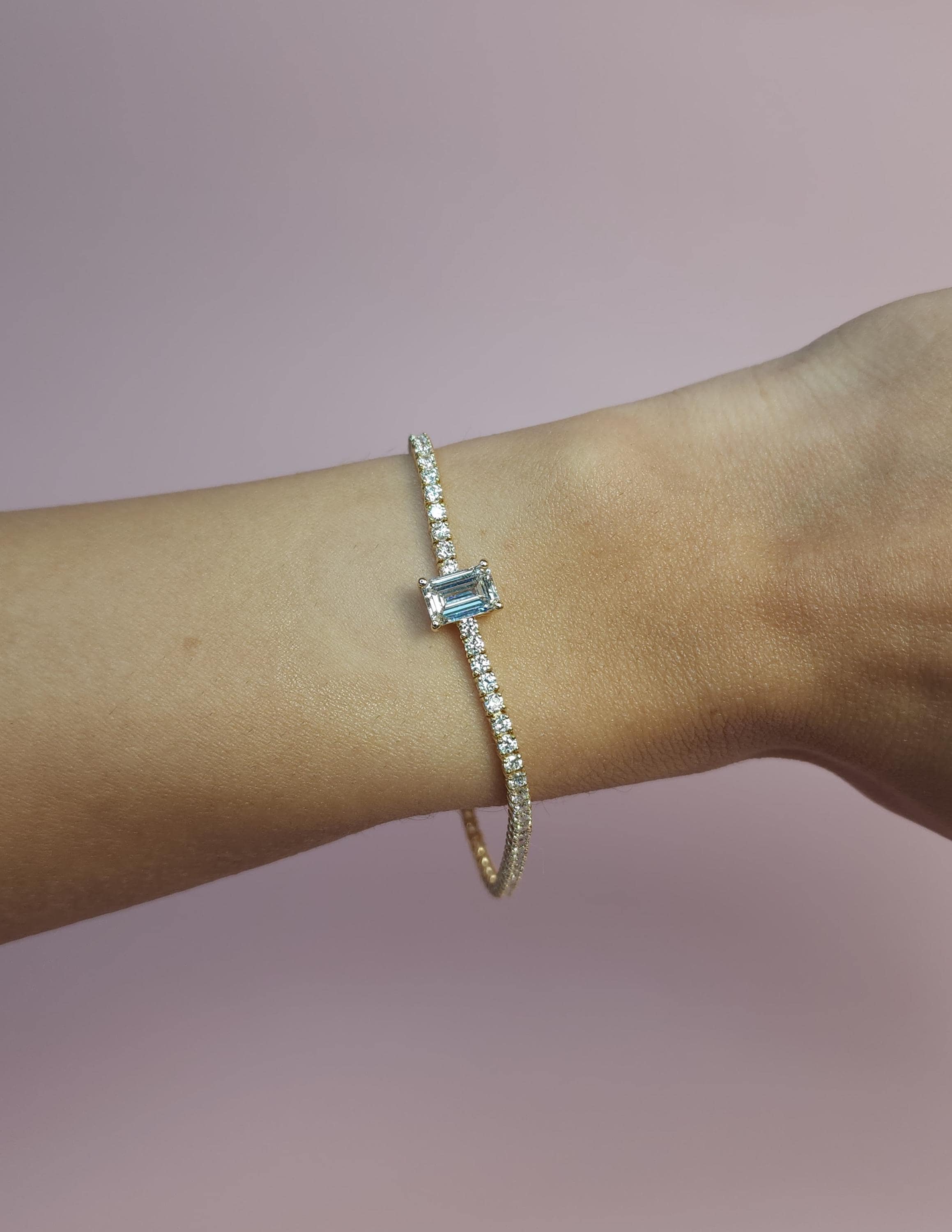 "Emerald Cut Diamond Bracelet / 14k Gold Miami Curb Link Chain Bracelet with Bezel Setting Emer...