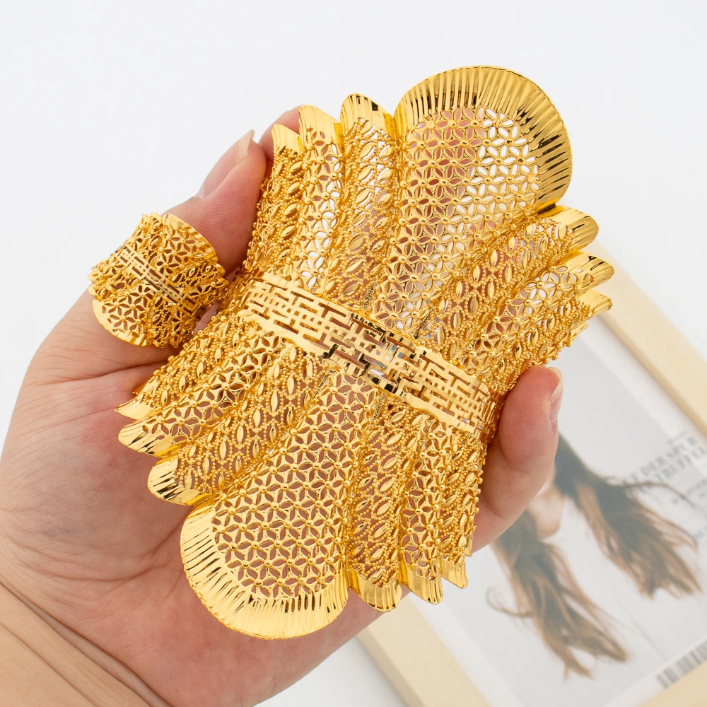 Bangle with Ring Jewelry Set for Party African 18k Gold Color Hand Bracelet Cocktail Ring 2Pcs Set f...