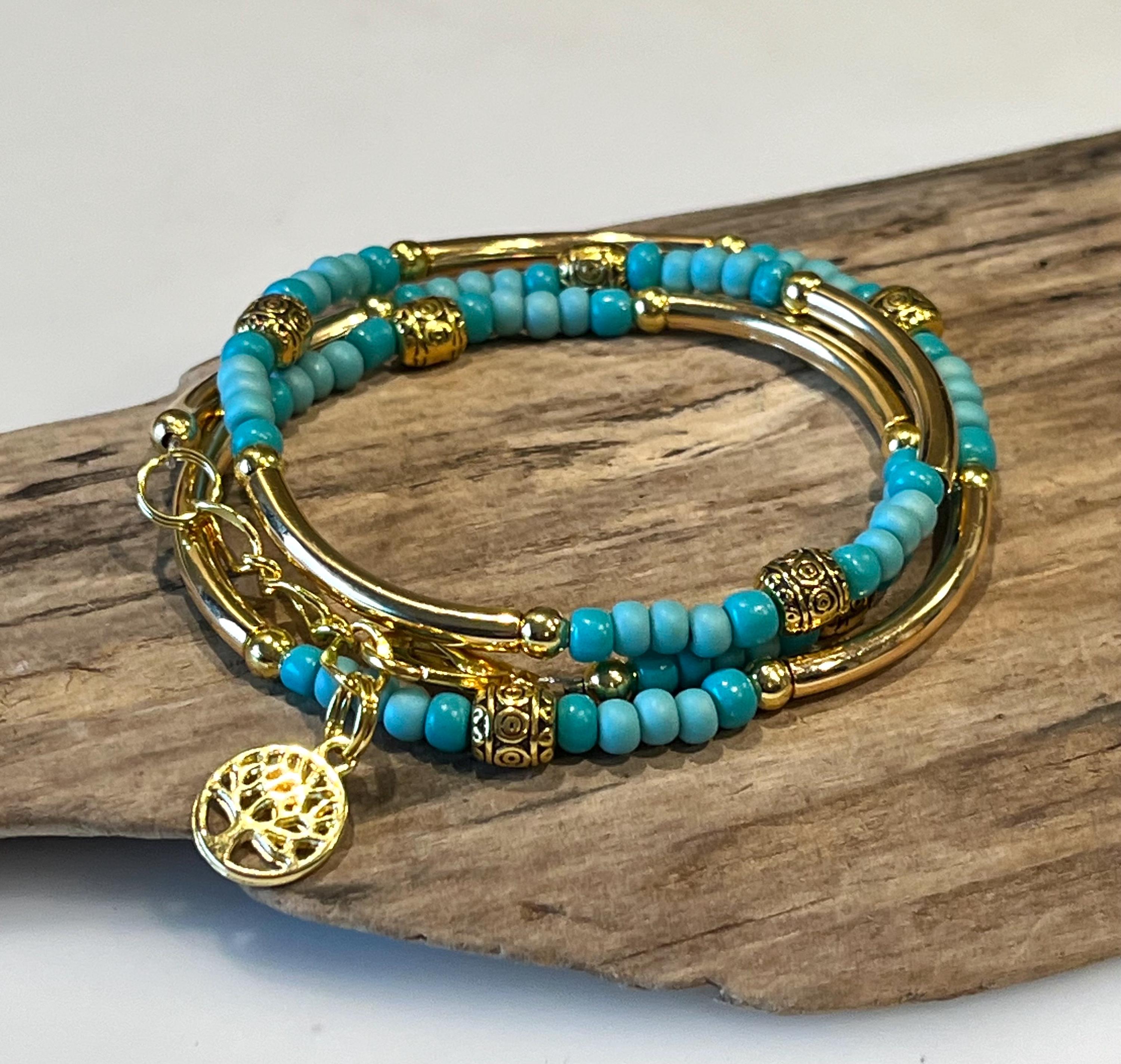 Aqua Blue, Turquoise, Boho Wrap, Gold Tube Wrap Bracelet,Black stac...
