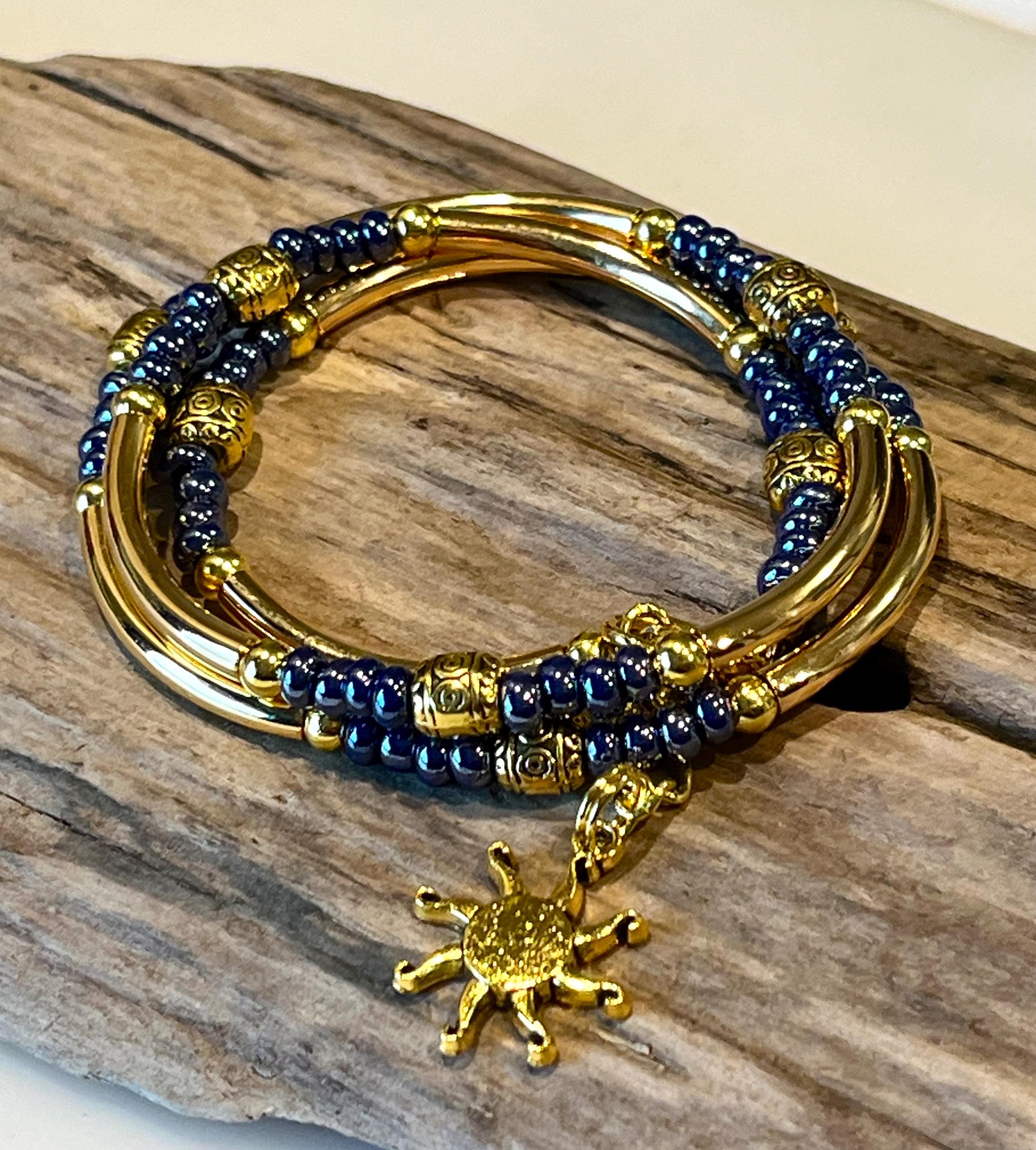 Dark Blue, Midnight Metallic blue Boho Wrap, Gold Tube Wrap Bracele...