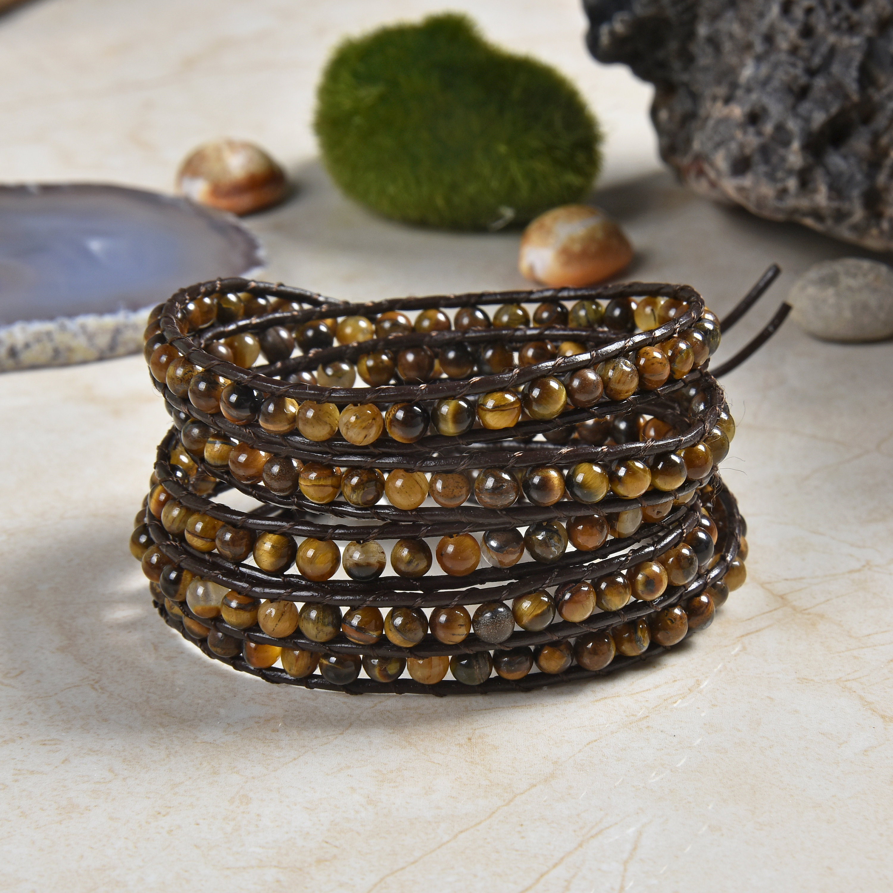 Tiger's eye leather Wrap Bracelet Five Wrap Bracelet. Natural Stone...