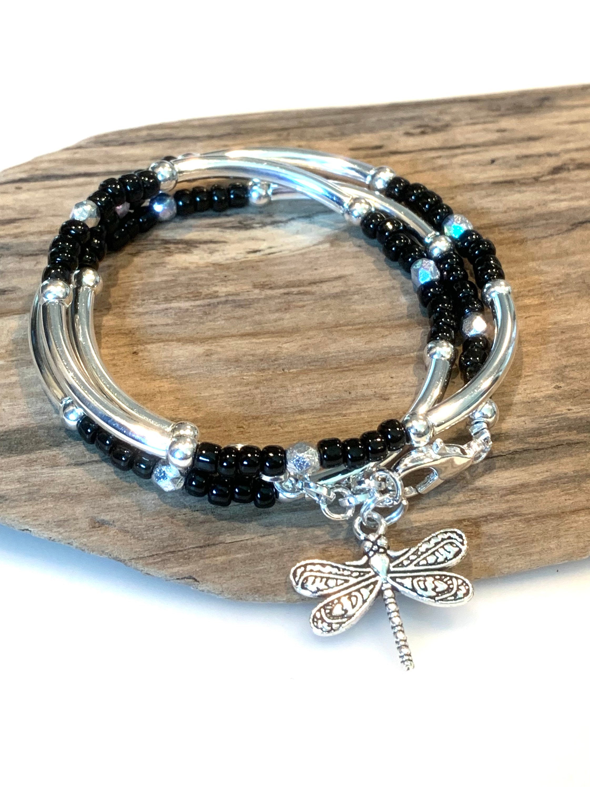 Black and Silver Boho Wrap, Silver Tube Wrap Bracelet,Black stack w...