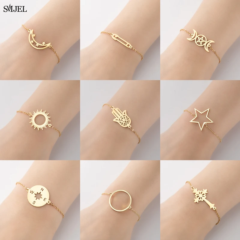 Stainless Steel Crescent Bracelets Fashion Sun Moon Star Charm Bracelet For Women Hamsa Supernatural...