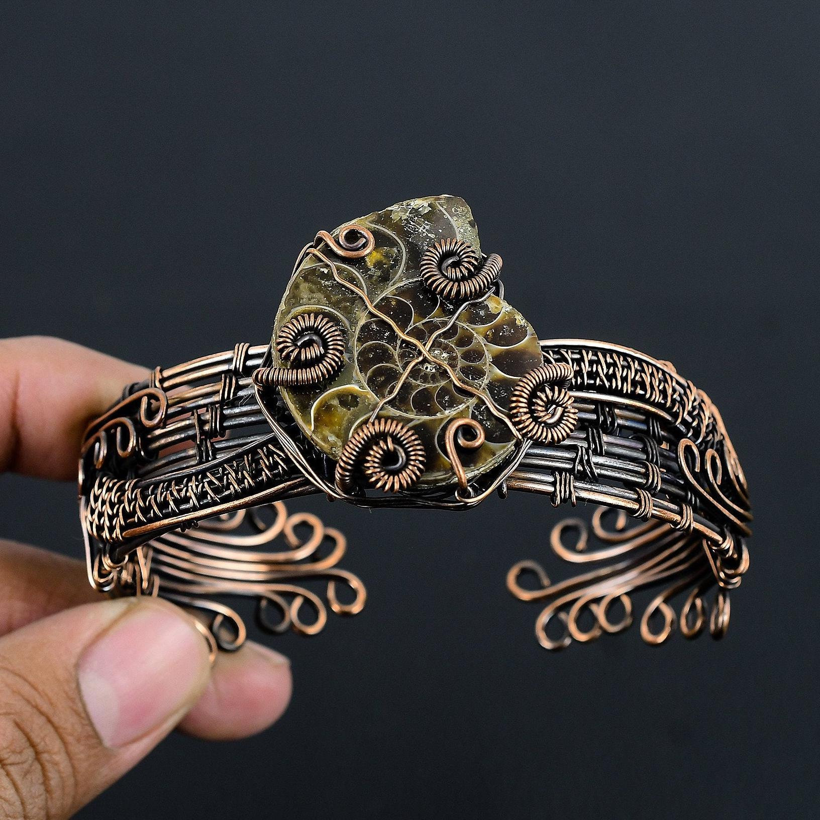Ammonite Fossil Bracelet, Natural Ammonite Fossil Solid Copper Wire...
