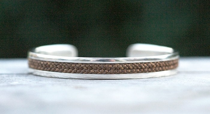 "10mm wide cuff bracelet with inlaid human hair braid. 9ct yellow, rose or white gold or sterli...
