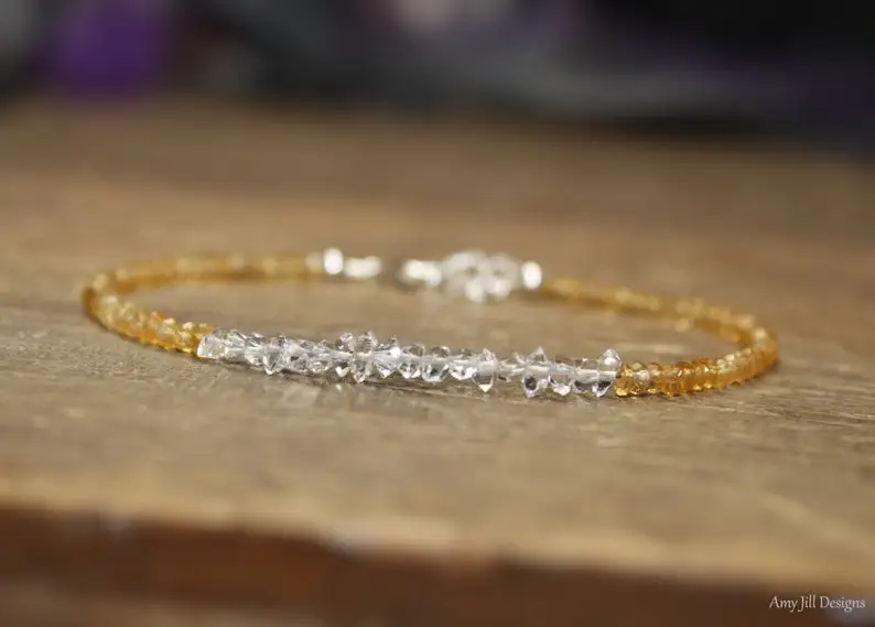 Citrine Herkimer Diamond Bracelet, Citrine Jewelry, November Birthstone, Beaded, Stacking Bracelet, ...