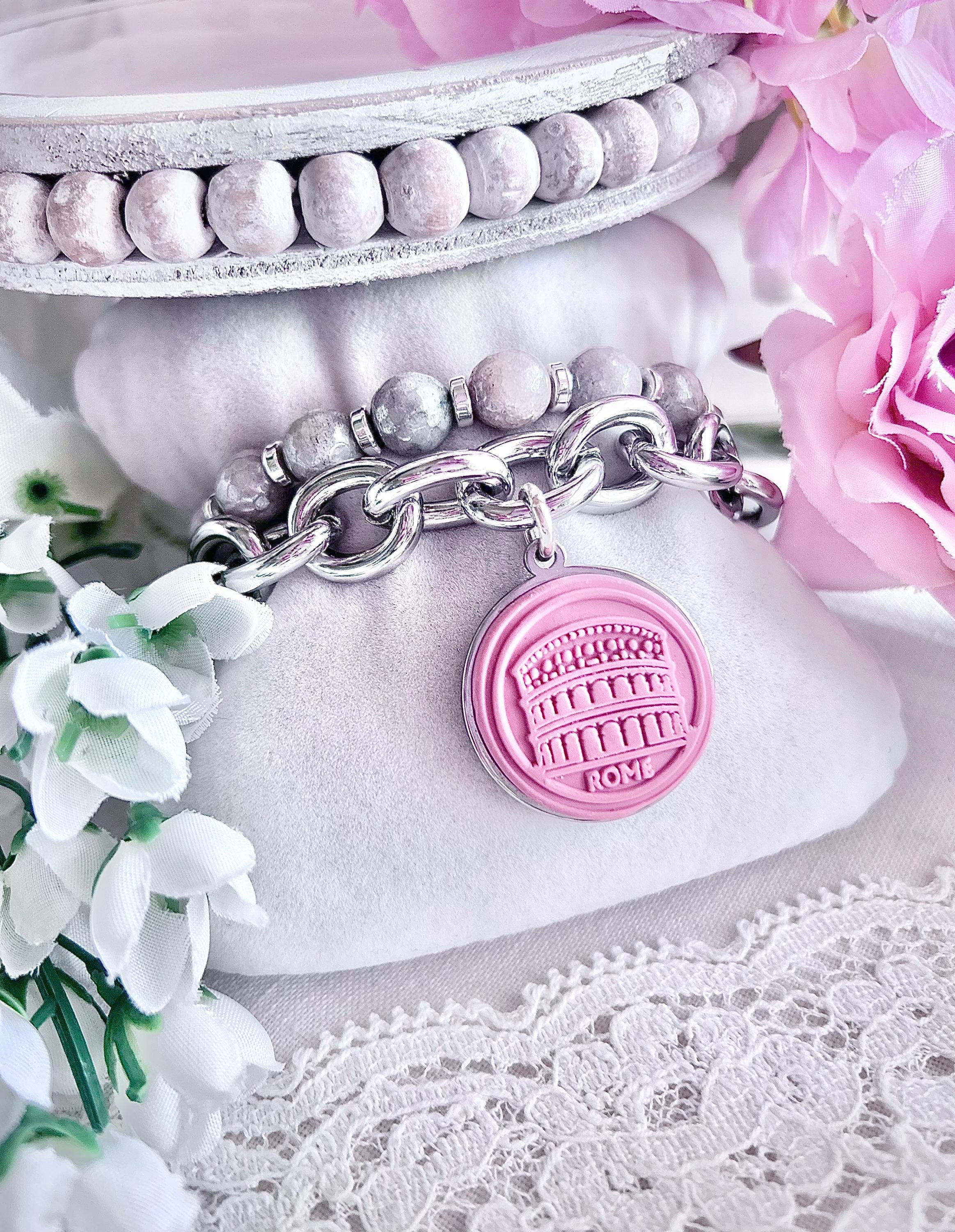 **Roman Colosseum Bracelet Set | Handcrafted Pendant on Silver Cuban Chain with Natural Stone Accent...