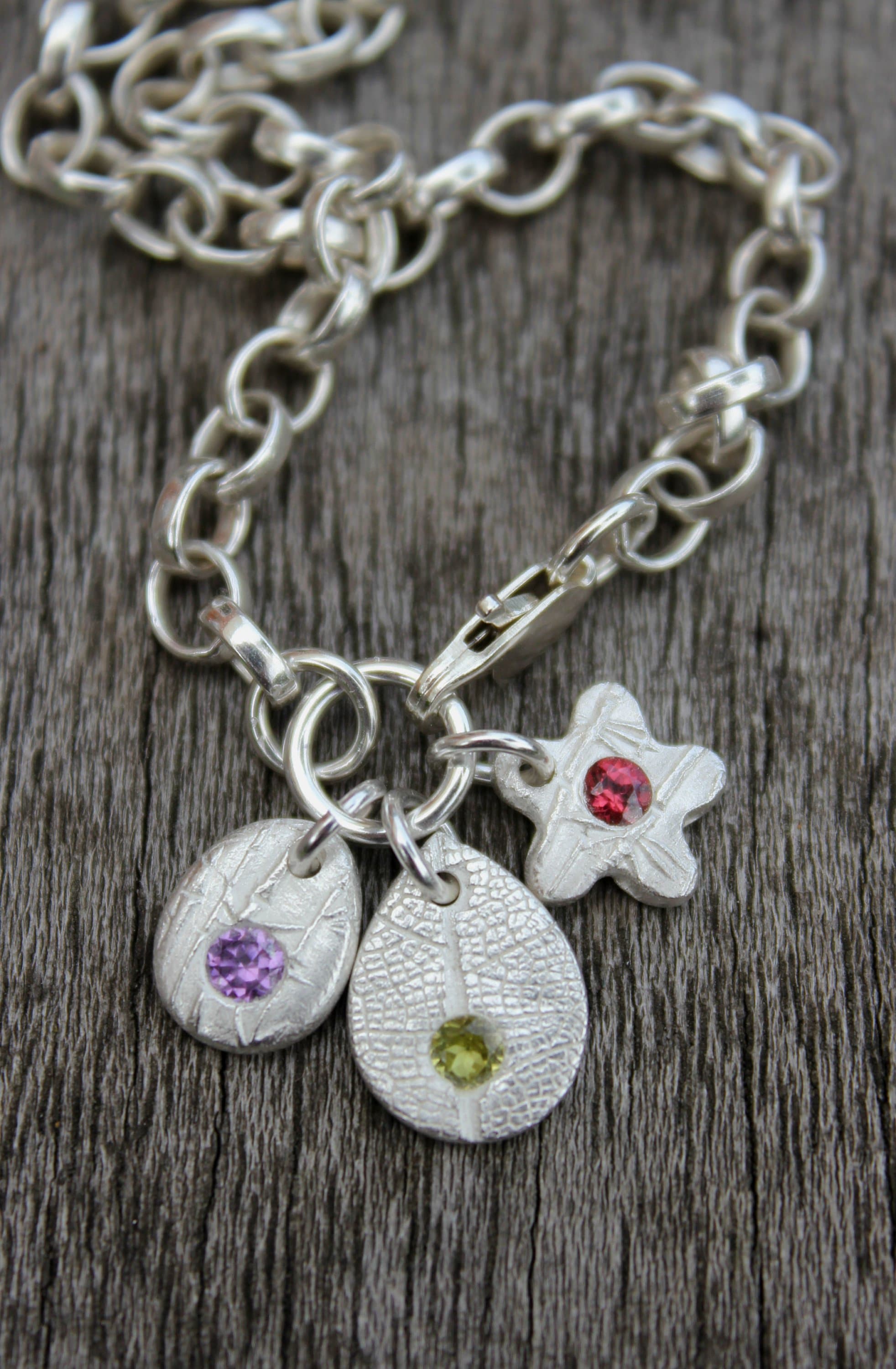Tiny gemstone charm bracelet, silver nature charms, peridot charm, garnet charm, amethyst charm, gem...