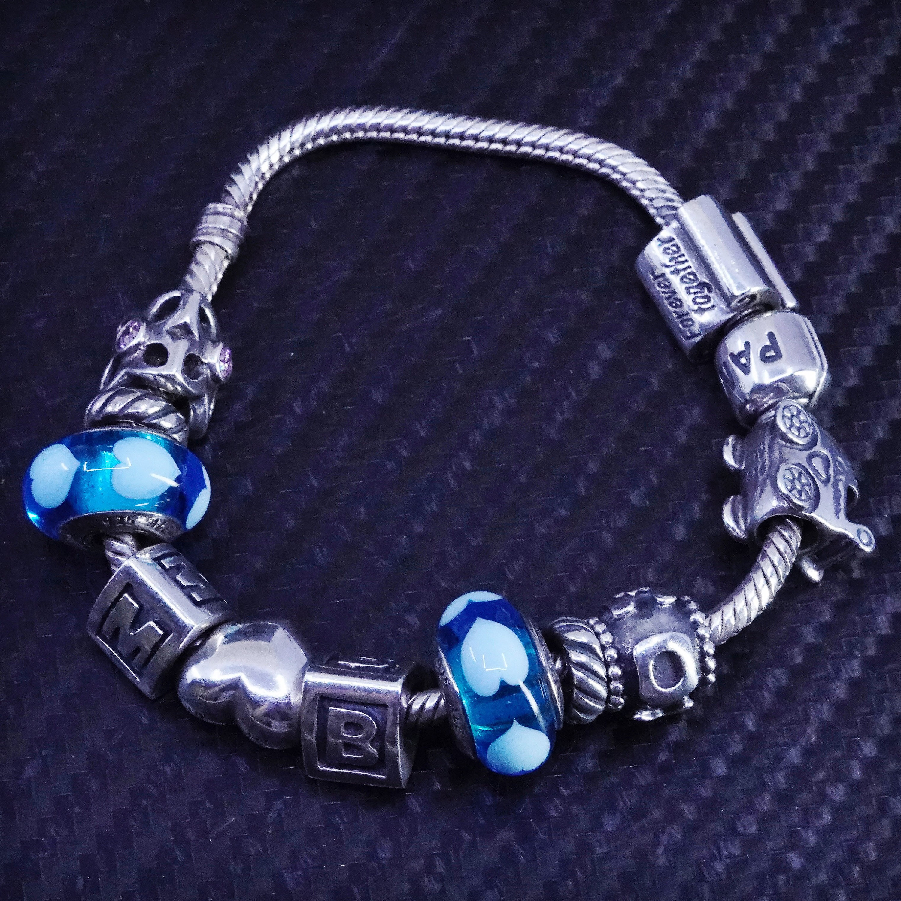 Sterling Silver Pandora Style Bracelet, Silver Snake Chain Heart Cl...