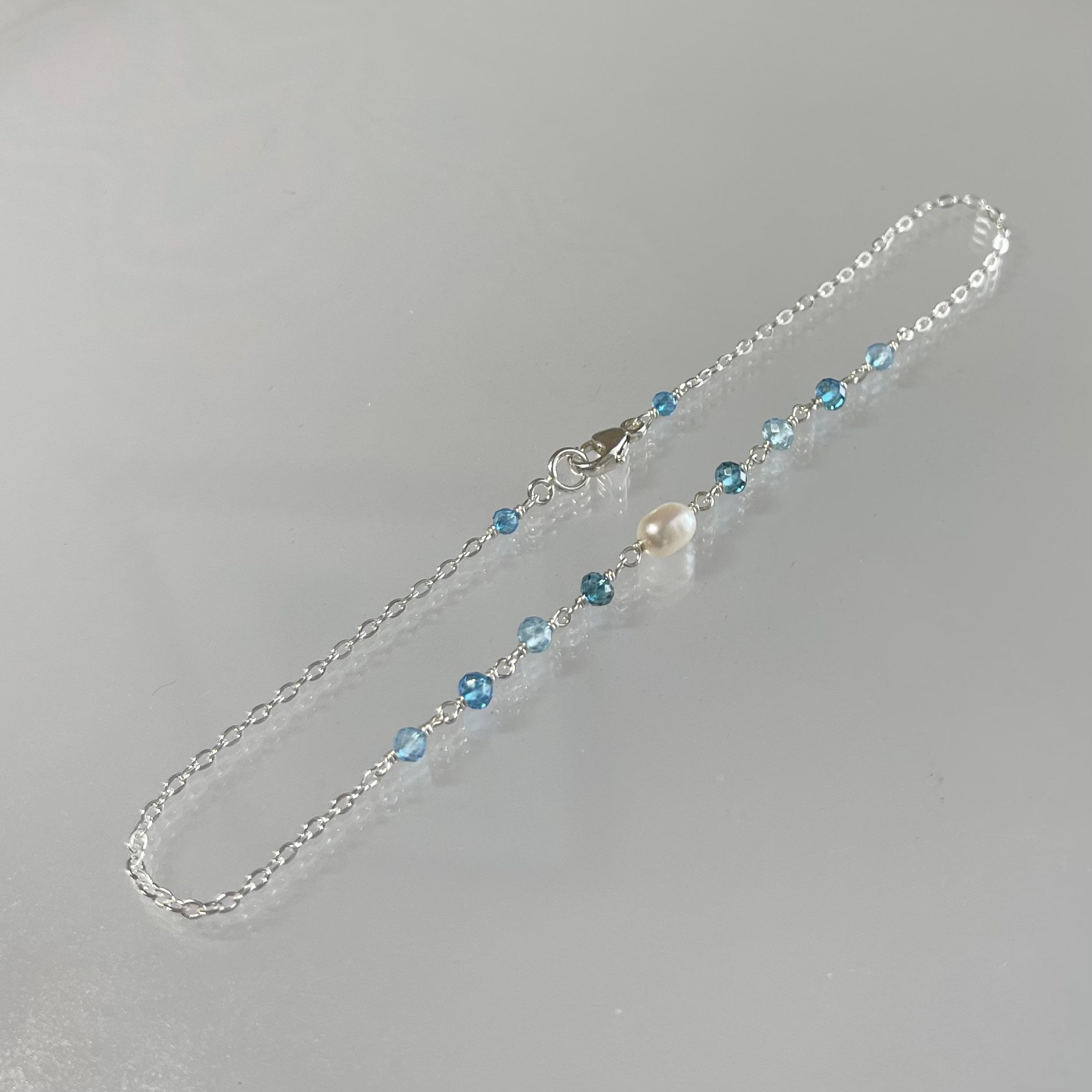 Multi blue topaz gemstone and freshwater pearl anklet in sterling silver This feminine something-blu...