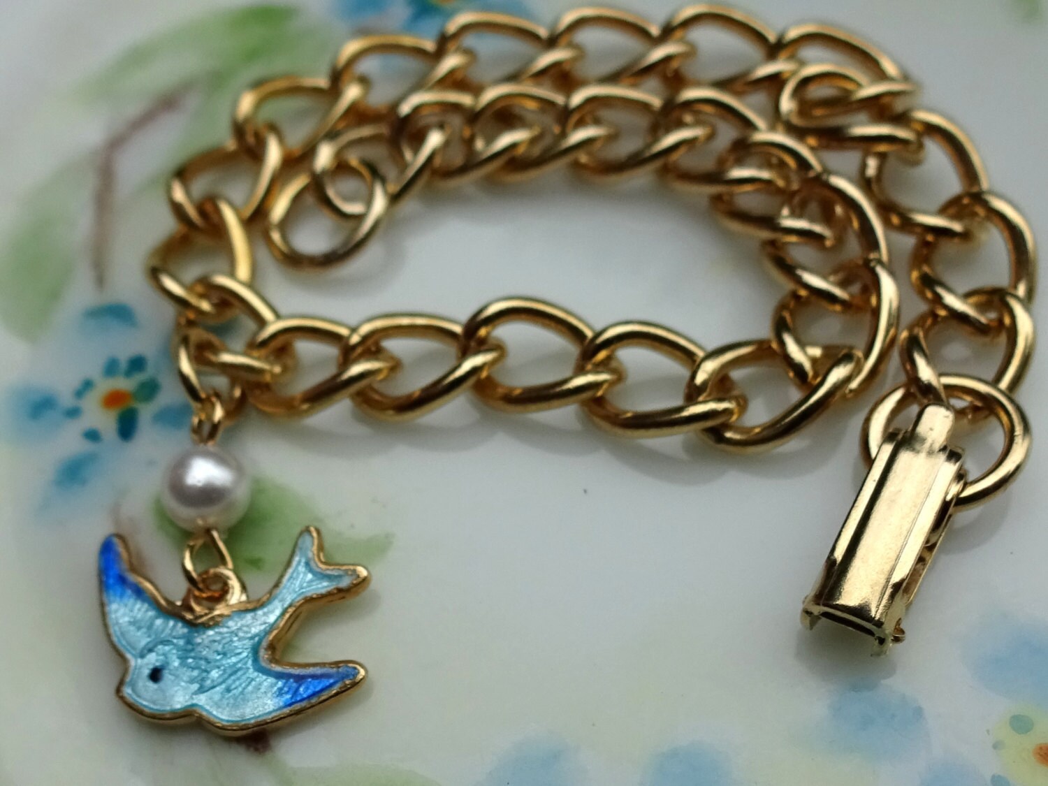 "This listing is for a beautiful Sarah Coventry bracelet with a delicate Guilloche blue bird. I...