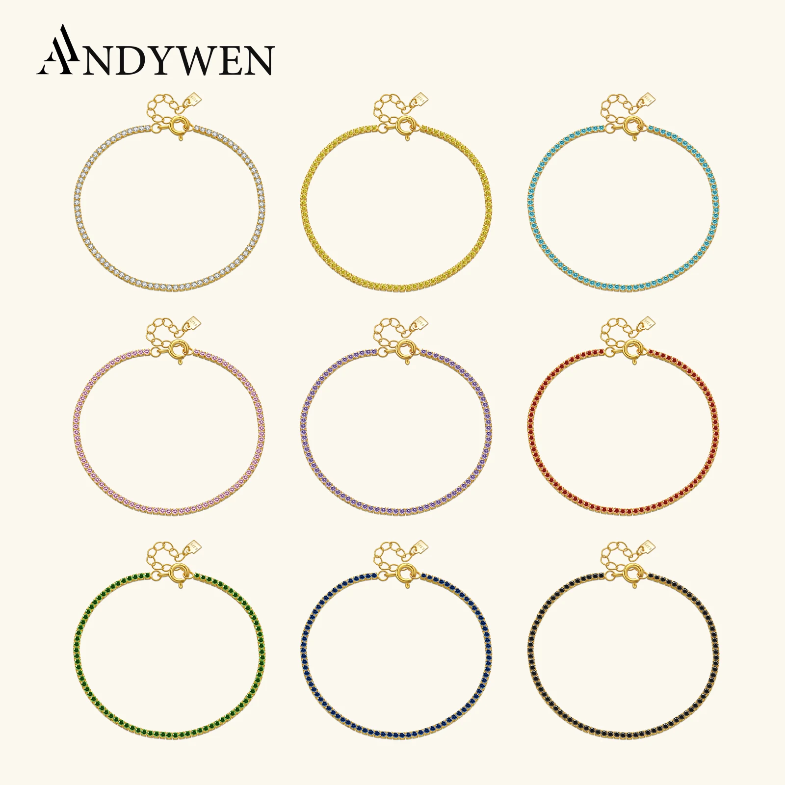 ANDYWEN 925 Sterling Silver Rainbow 1.5mm Tennis Chain Bracelet Lux...