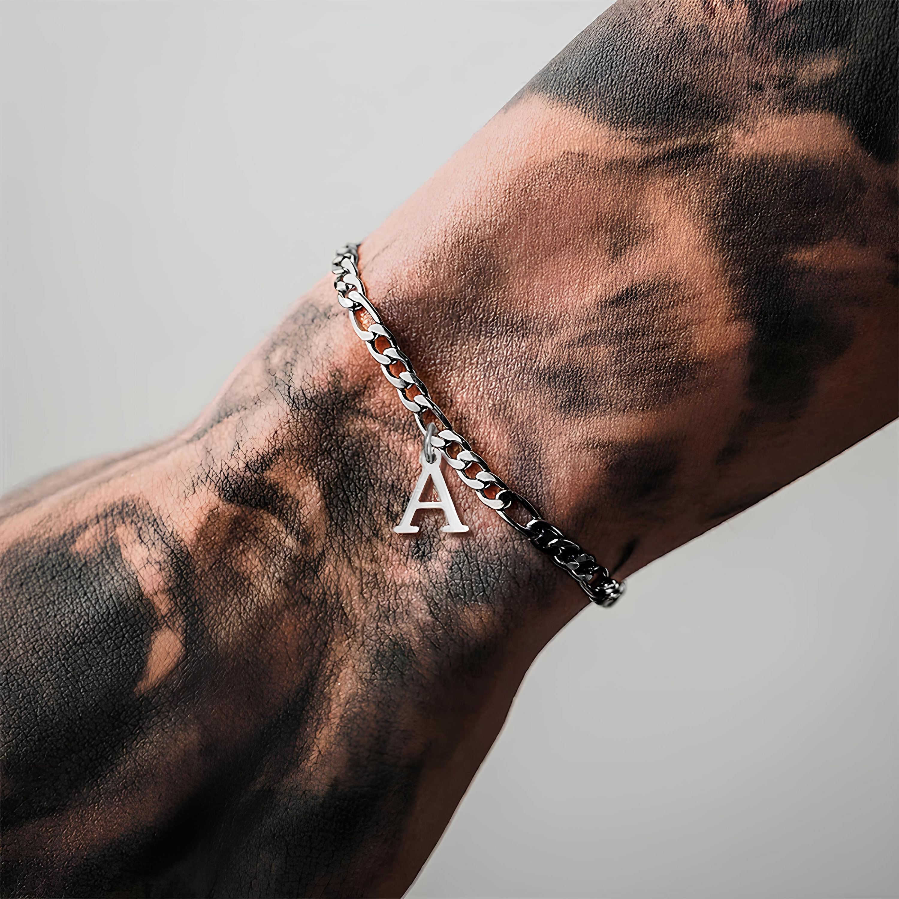 Figaro Bracelet: Mens Initial Bracelet, Silver Figaro Chain For Him...