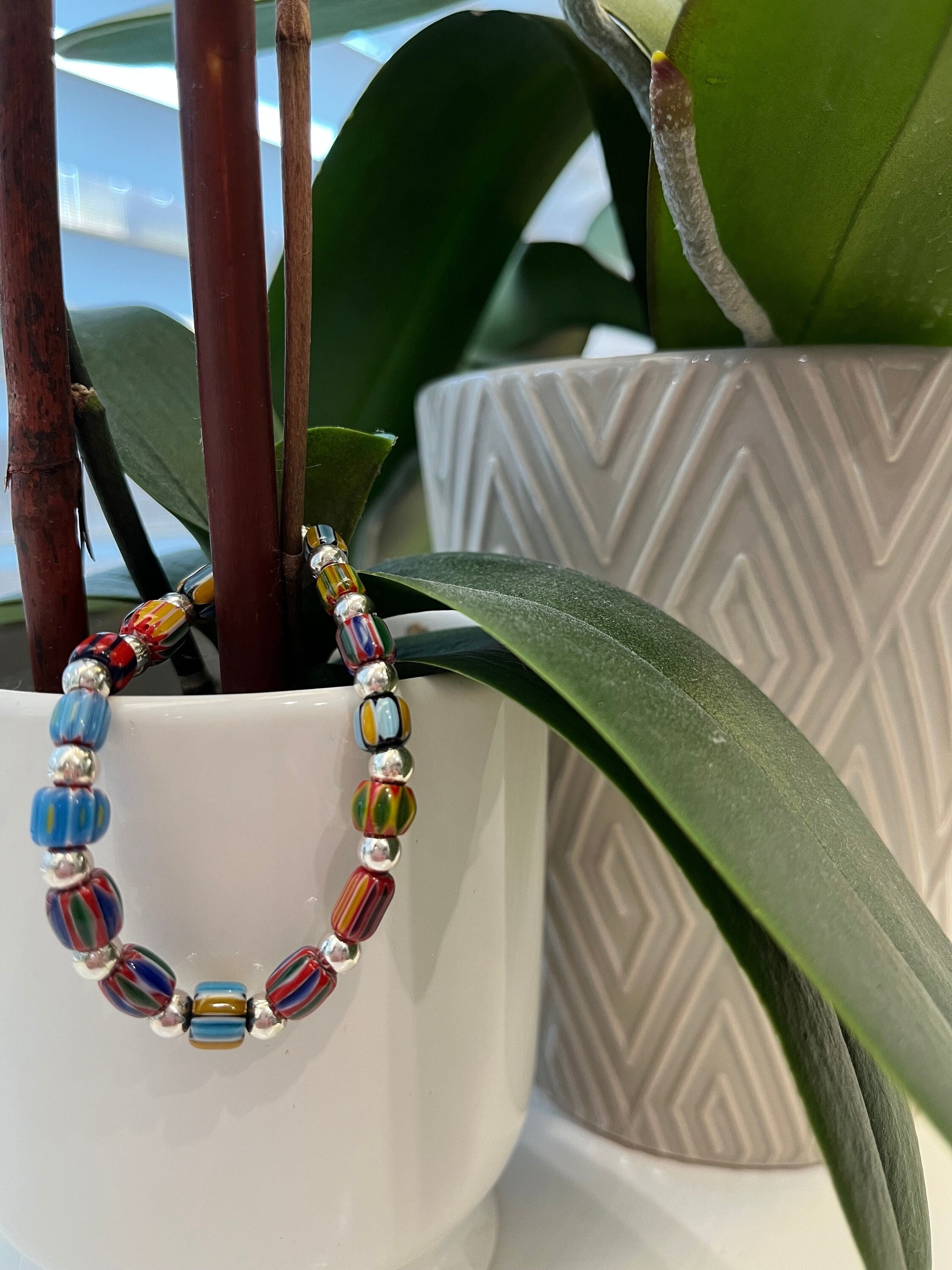 Handmade bracelet using multicolored glass Millefiori beads with metal accents. The bracelet is a st...