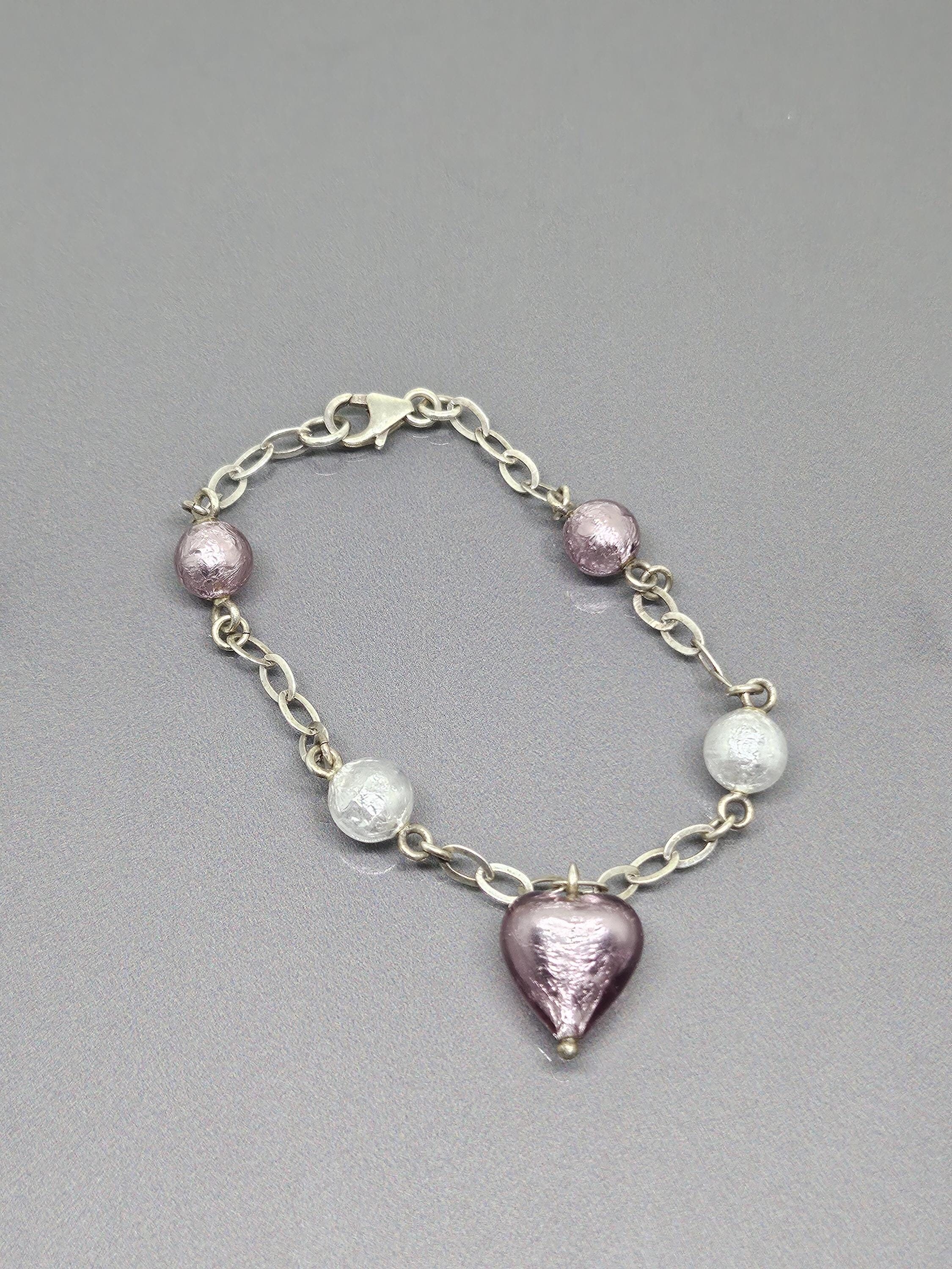 925 Sterling Silver - Vintage Lampwork Murano Glass Heart Bracelet Silver Foil Glass Bracelet Murano...